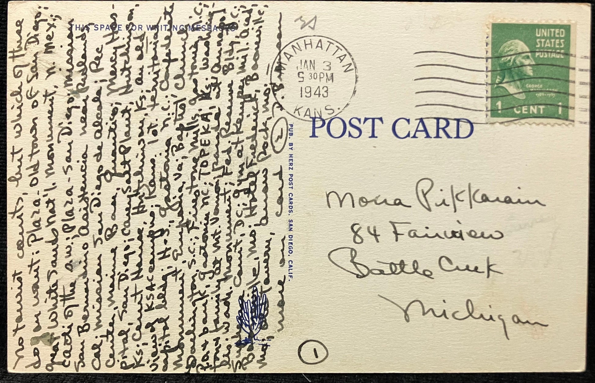 Mailed: Postmark January 3, 1943, Manhattan, Kansas - a green George Washington one cent stamp.