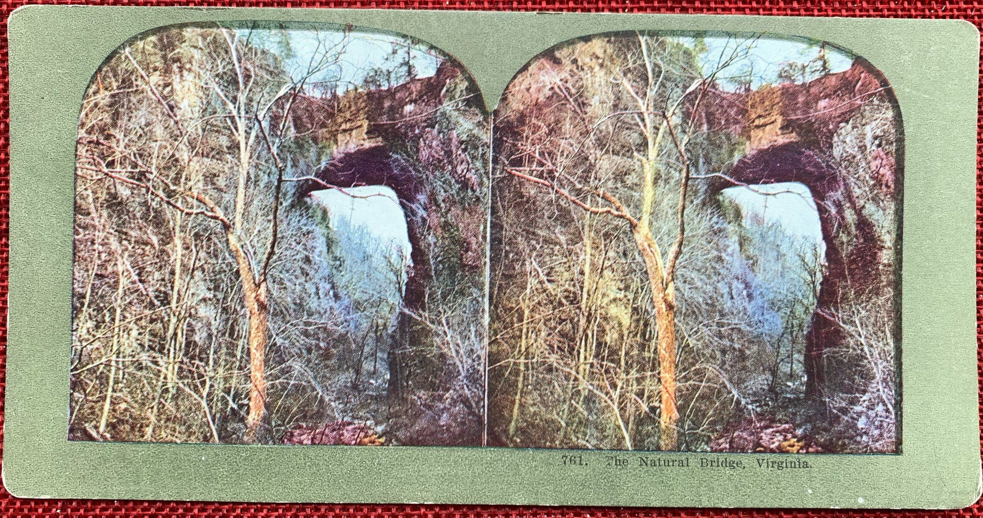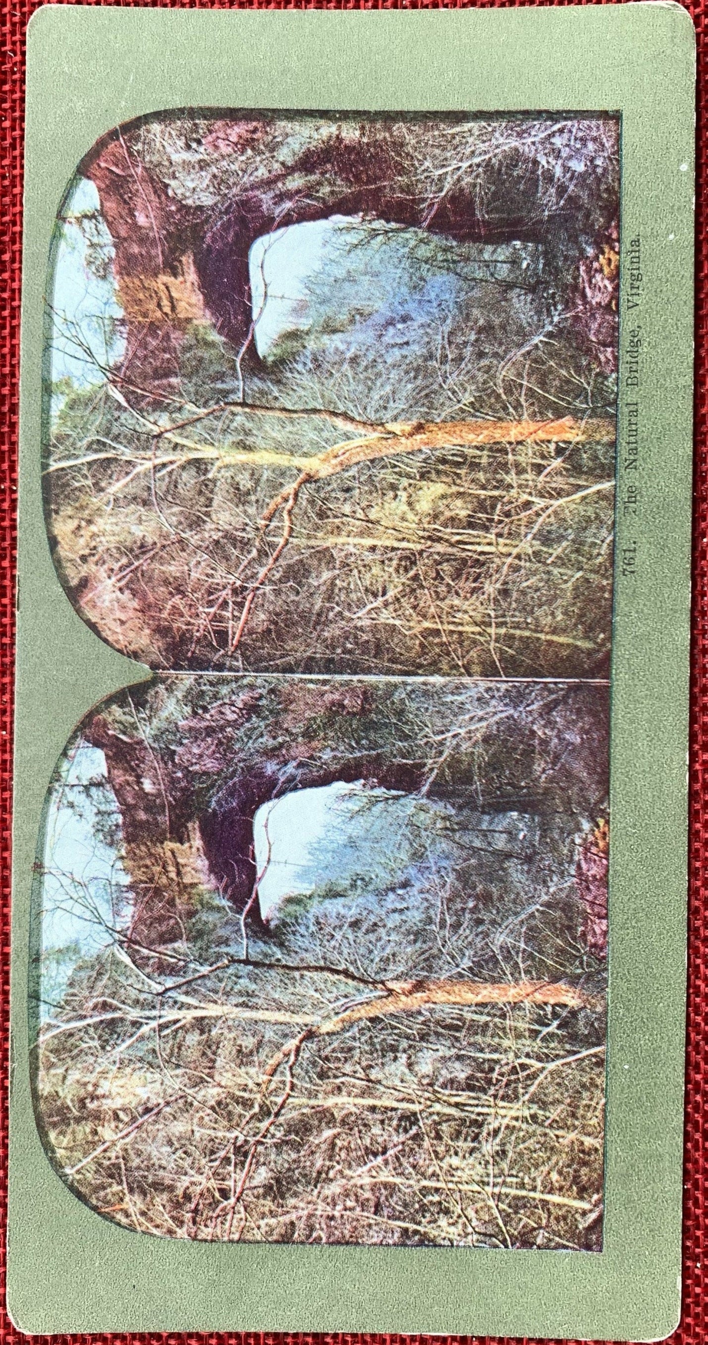 This vintage stereo view card features two color images of The Natural Bridge, located in Virginia in the Appalachian Mountains.