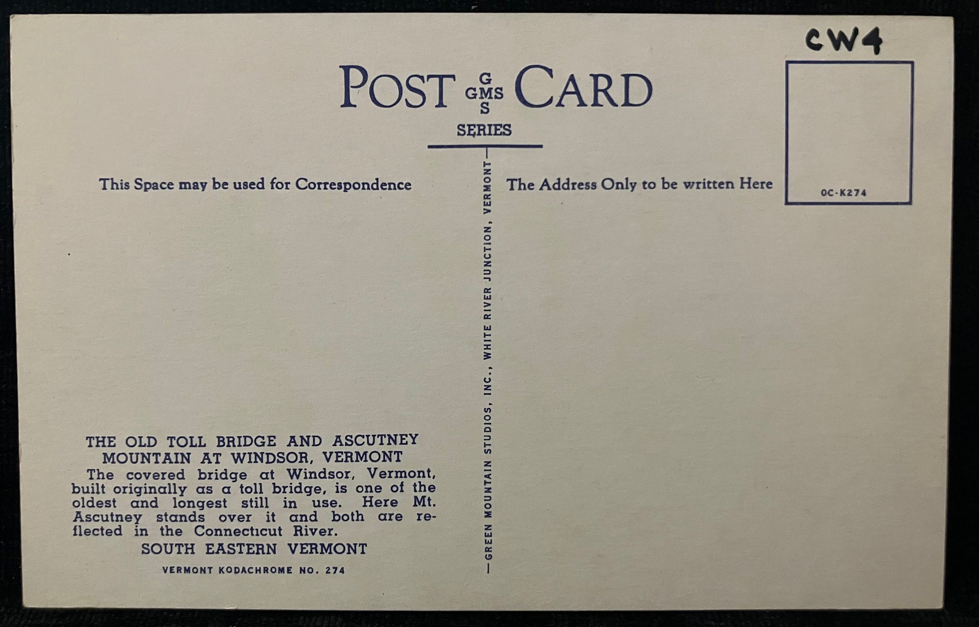 On front: A photo of The Old Toll Bridge and Ascutney Mountain at Windsor, Vermont