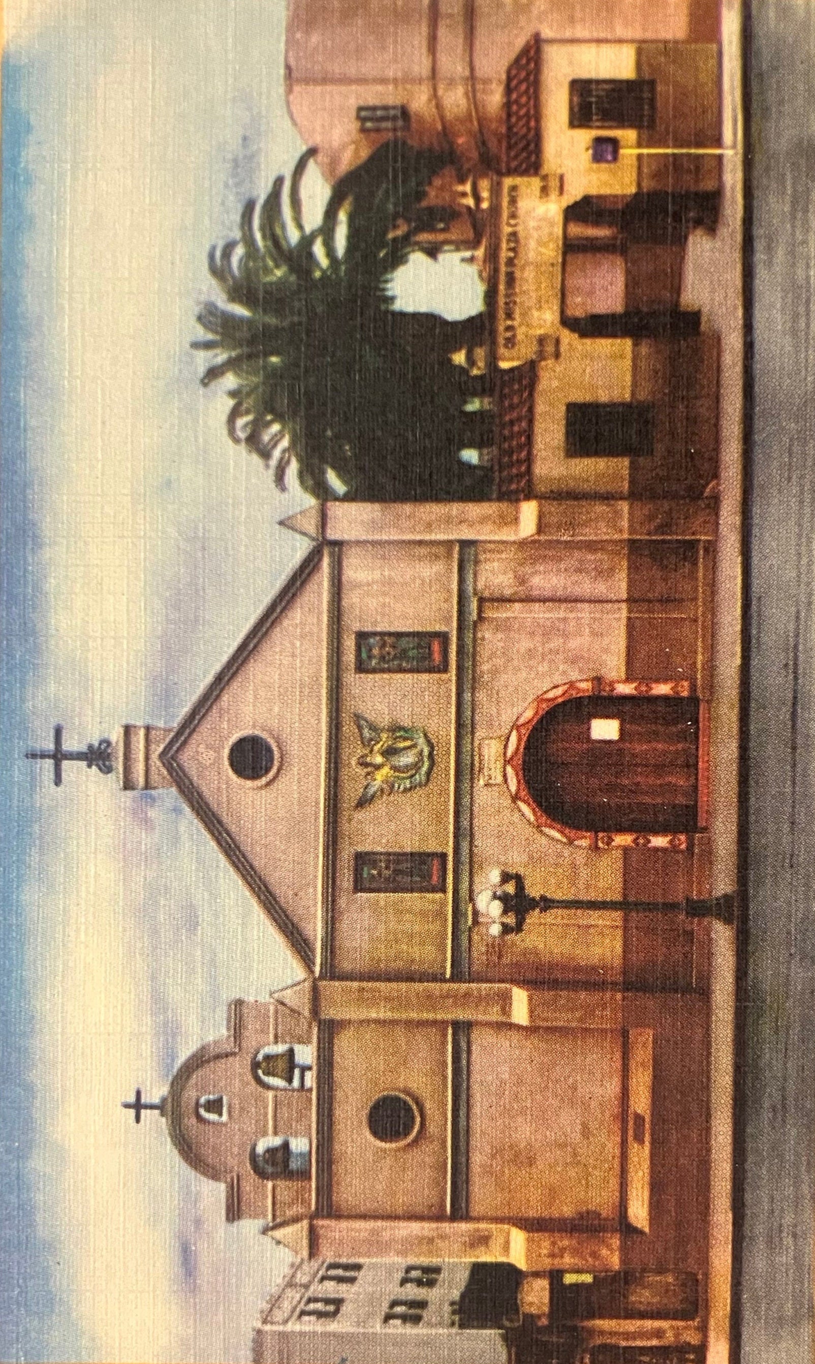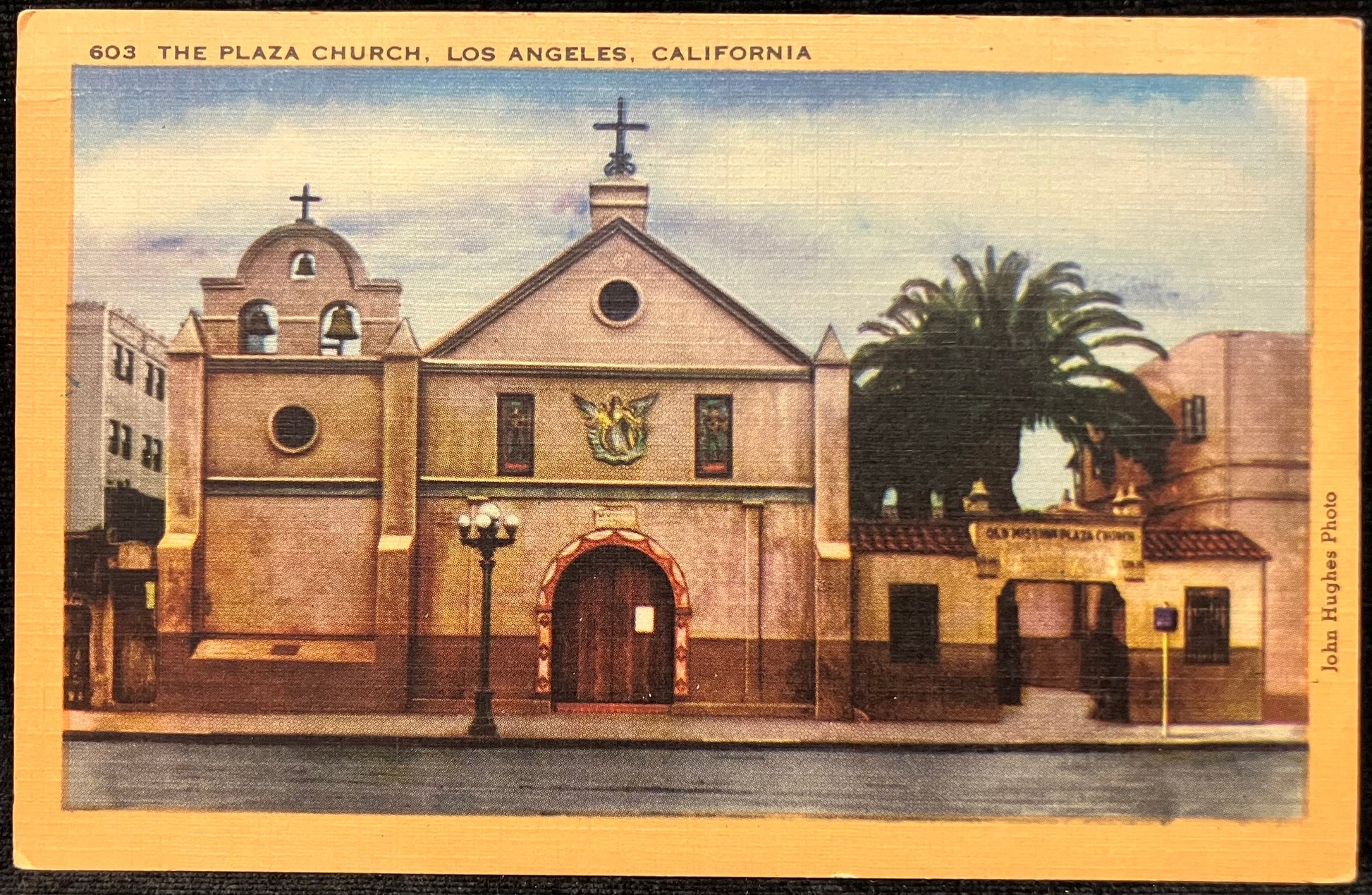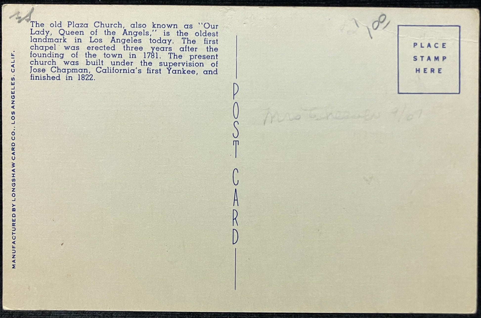 On back: The old Plaza Church, also known as “Our Lady, Queen of the Angels,” is the oldest landmark in Los Angeles today. The first chapel was erected three years after the founding of the town in 1781. The present church was built under the supervision of Jose C Hapman, California’s first Yankee, and finished in 1822.