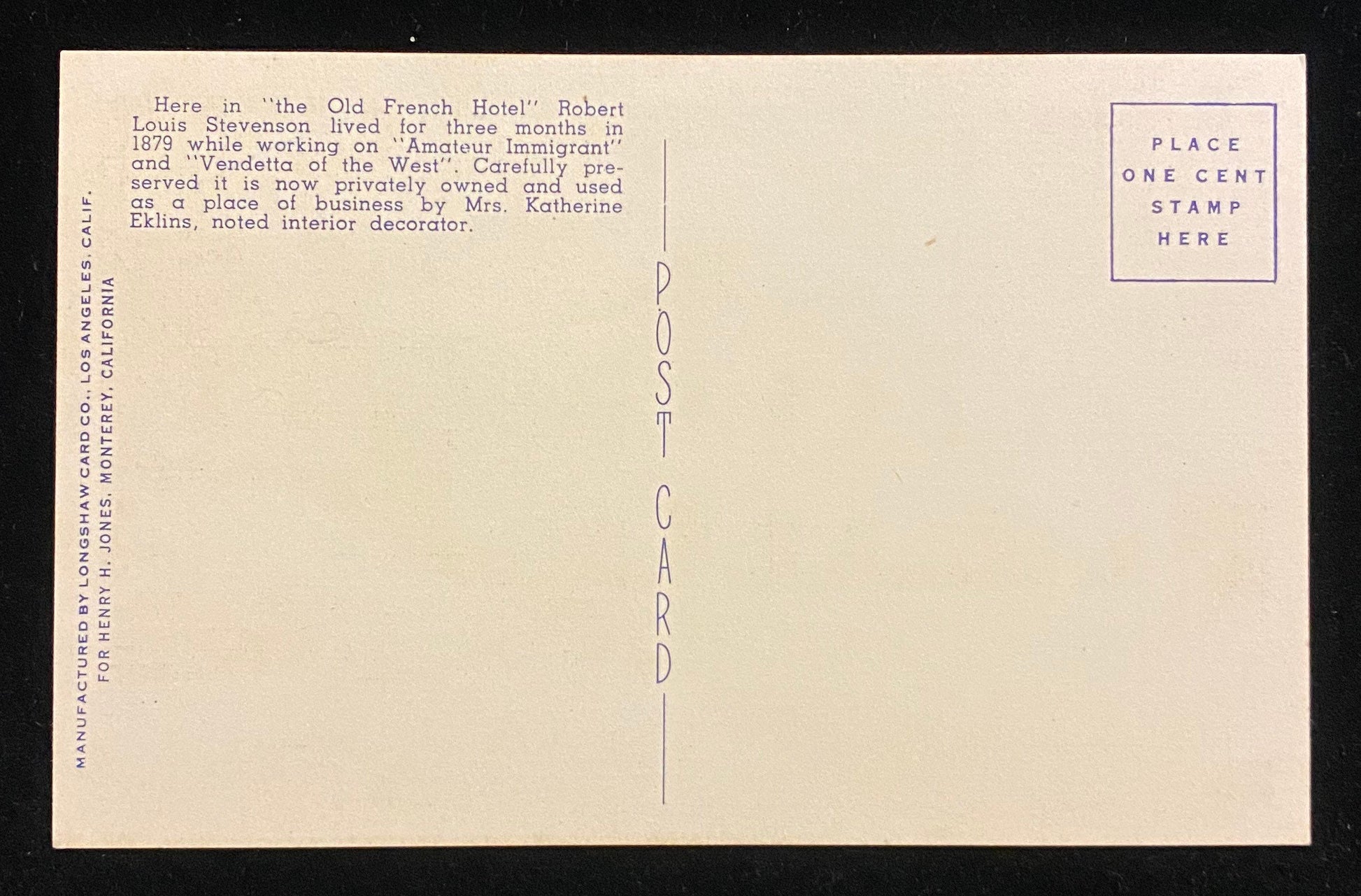 Back Information: "Here in 'the Old French Hotel' Robert Louis Stevenson lived for three months in 1879 while working on 'Amateur Immigrant' and 'Vendetta of the West'. Carefully preserved it is now privately owned and used as a place of business by Mrs. Katherine Eklins, noted interior decorator."
