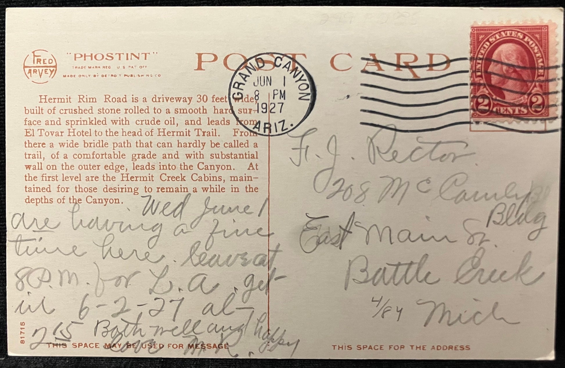 Mailed: Postmark on June 1st, 1927 from Grand Canyon, Arizona. Red 2 cent stamp