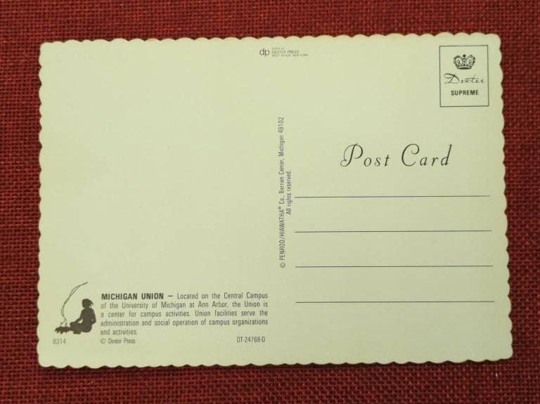 Back: Located on the Central Campus of the University of Michigan at Ann Arbor, the Union is a center for campus activities. Union facilities serve the administration and social operation of campus organization. Made by Dexter Press. Produced in the 1970s.