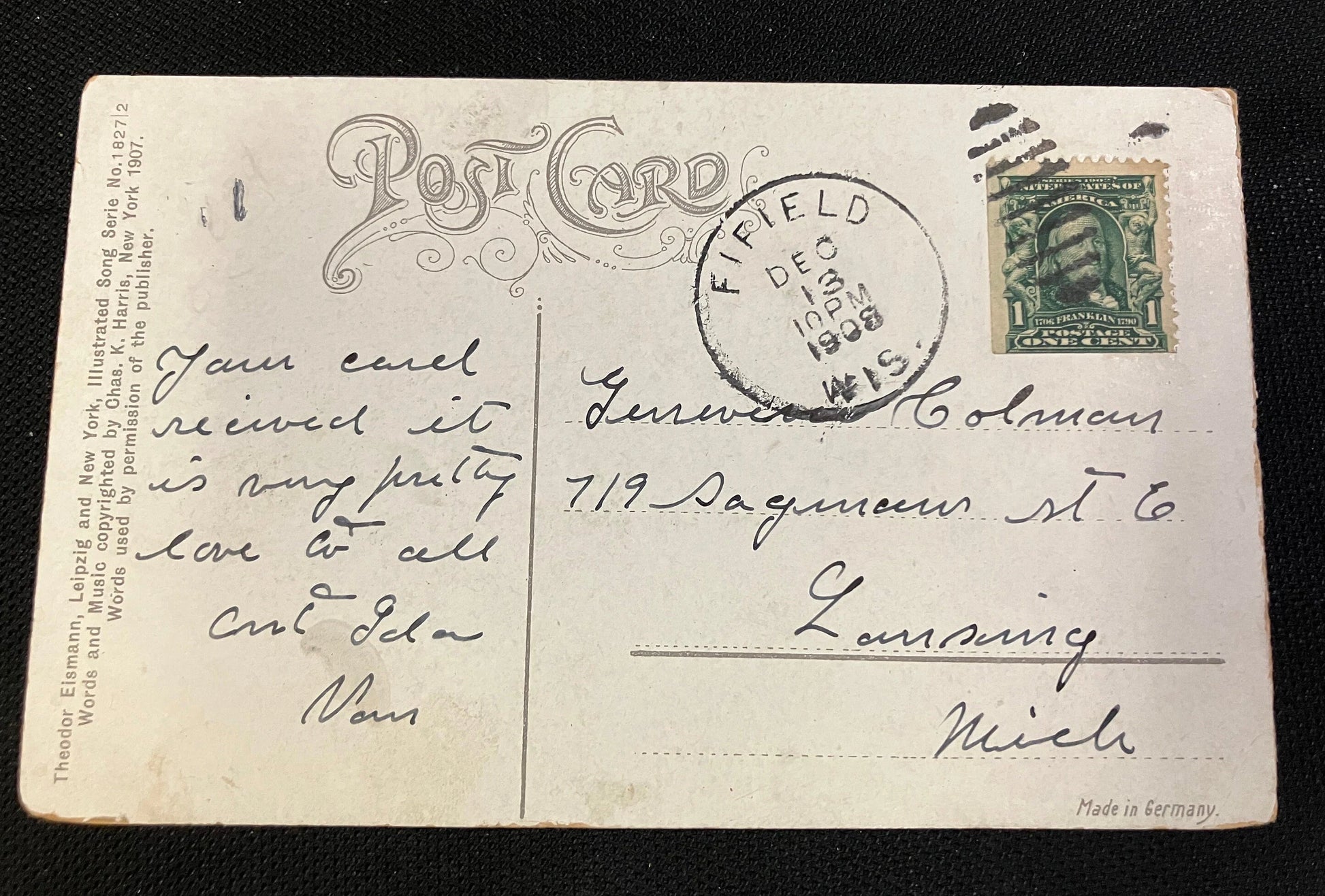 Mailed: December 13, 1908 from Fifield, Wisconsin, with green 1 cent stamp