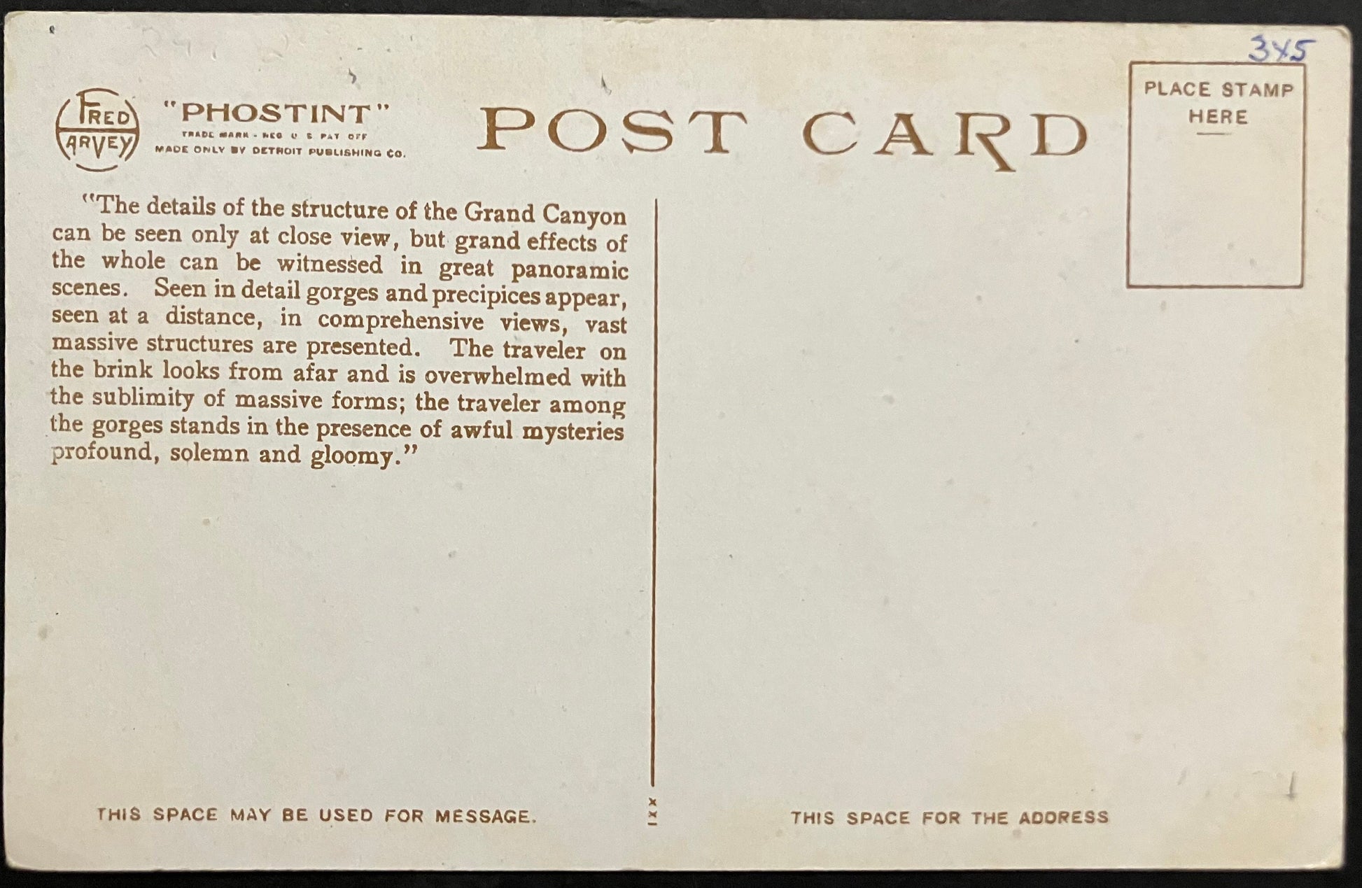 Back: “The details of the structure of the Grand Canyon can be seen only at close view, but grand effects of the whole can be witnessed in great panoramic scenes Seen in detail gorges and precipices appear seen at a distance, in comprehensive views, vast massive structures are presented. The travel on the brink looks afar and is overwhelmed with the sublimity of massive forms; the traveler among the gorges stands in the presence of awful mysteries profound, solemn and gloomy.”