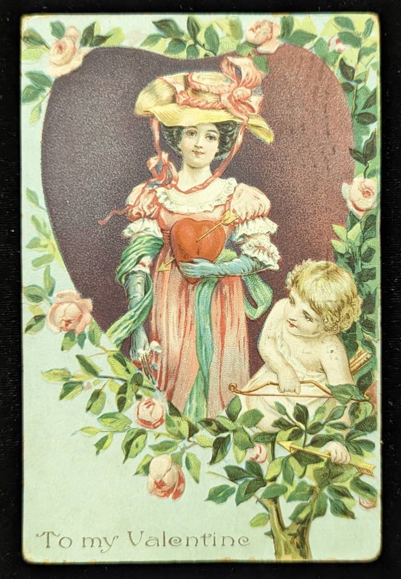 To my Valentine with Cupid and Lady with Pierced Heart - Vintage Valentine Postcard