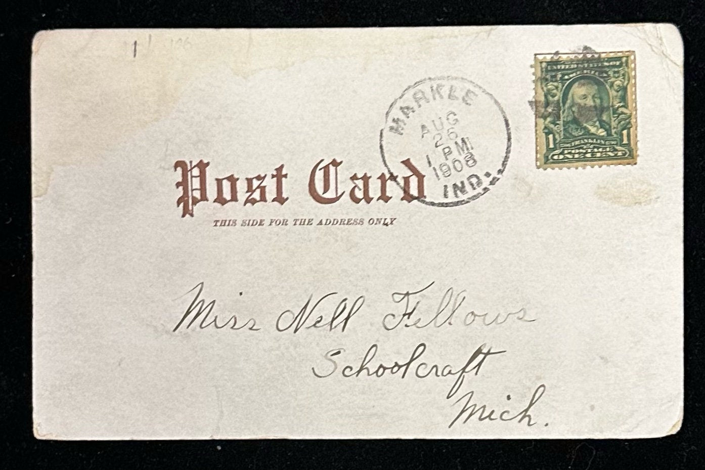 Mailed: Posted on August 26th, 1908 from Markle, Indiana with a green 1 cent Ben Franklin stamp