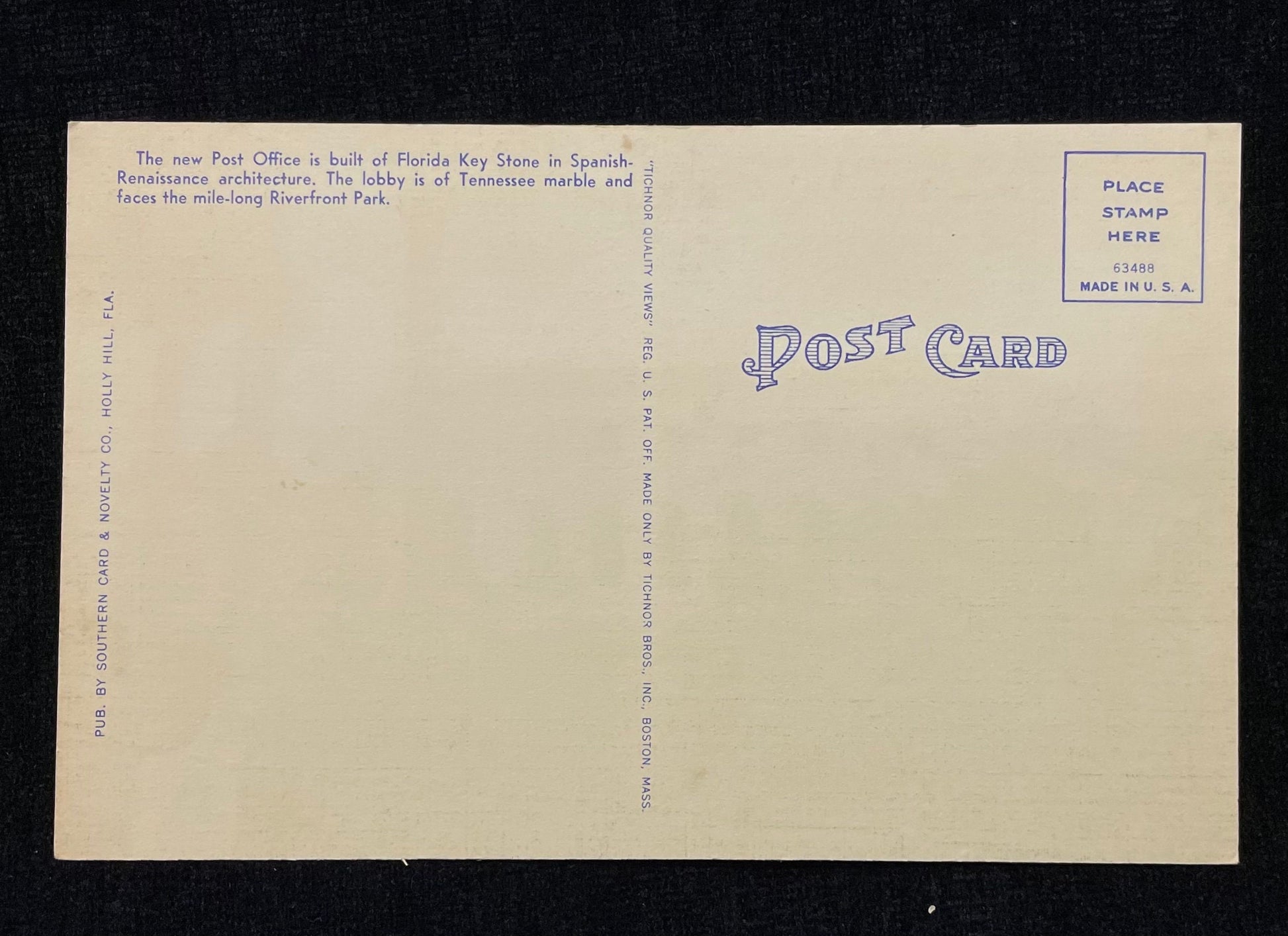 Back Information: "The new Post Office is built of Florida Key Stone in Spanish-Renaissance architecture. The lobby is of Tennessee marble and faces the mile-long Riverfront Park."