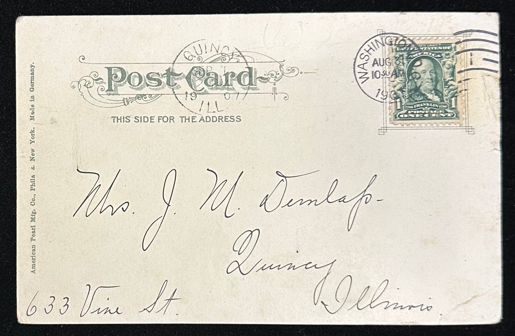 Mailed: Posted on August 31st, 1907 from Washington, D.C. and again on September 1st, 1907 from Quincy, Illinois with a green 1 cent Benjamin Franklin stamp