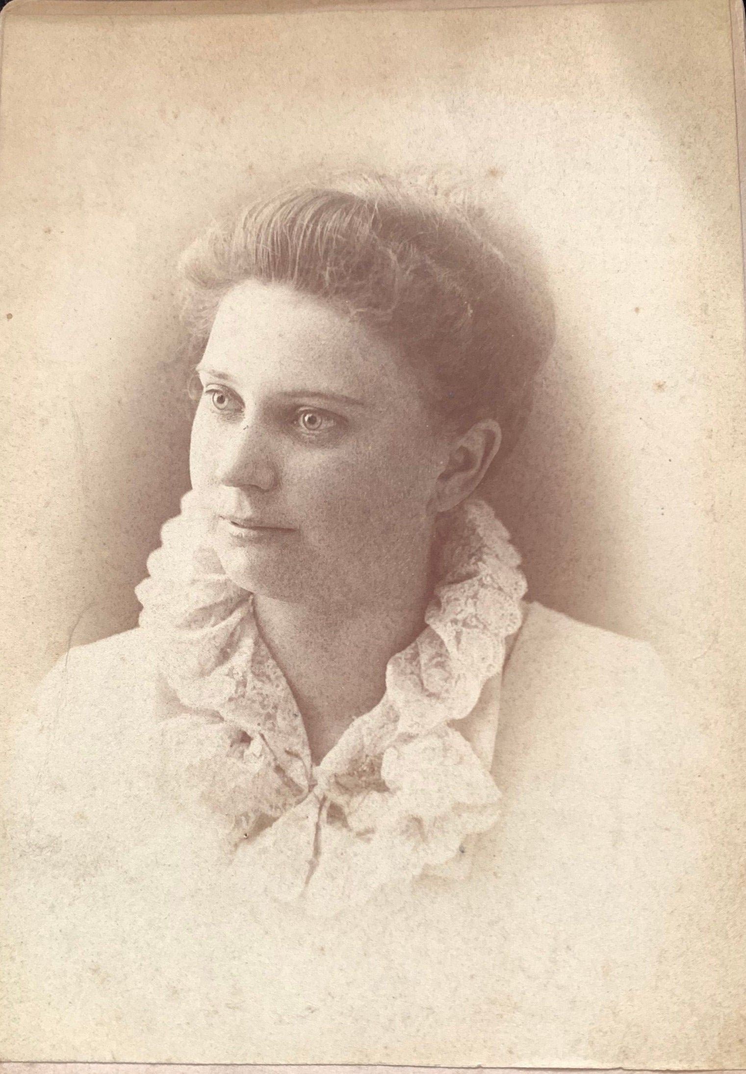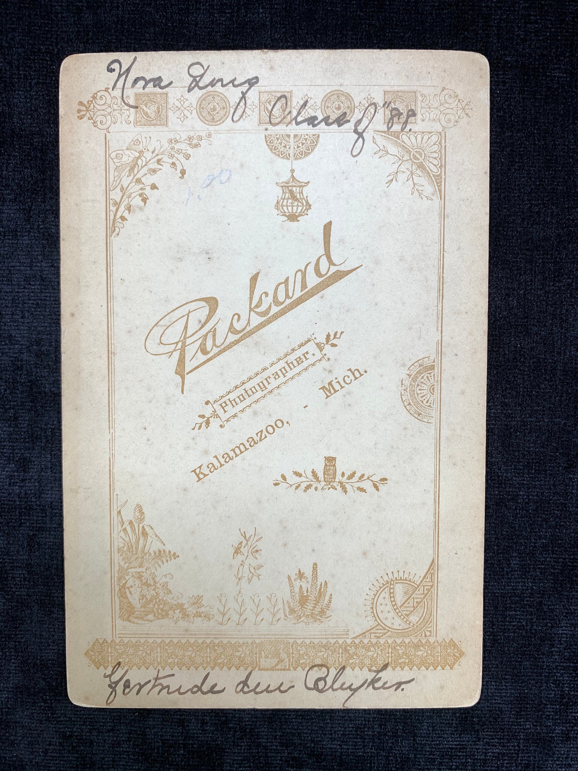 This photograph features a well dressed young woman, Nora Long, class of 1888. This was a graduation picture. She has somewhat of a smile on her face, which is unusual for photos of this time period as the subject had to sit still for a long time while the photo was taken. This photograph was taken by the photographer Cullen C. Packard in Kalamazoo, Michigan in 1888.