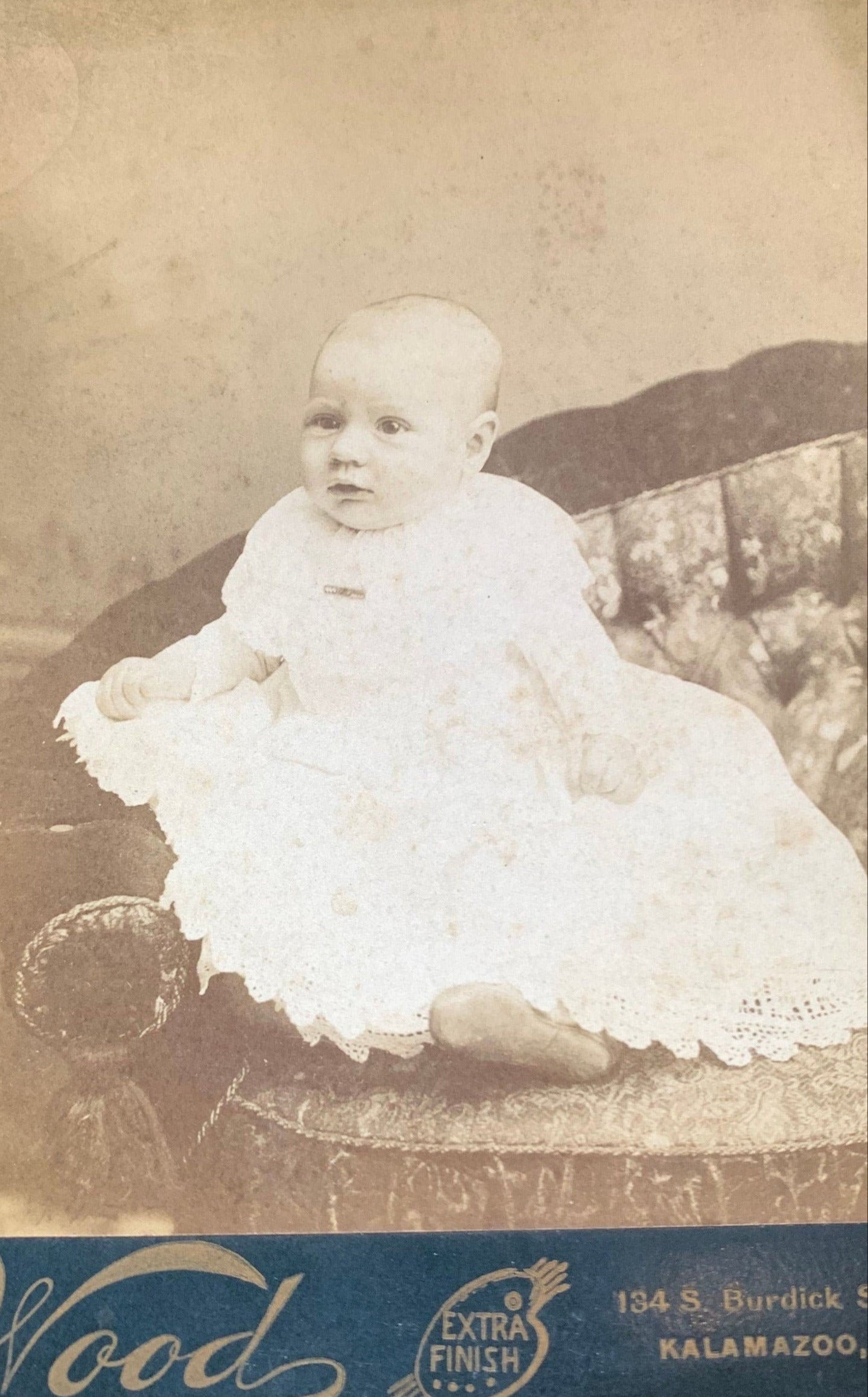 This photograph features a baby in a white gown, probably for a Baptismal celebration, sitting on a sofa. The baby looks very healthy and most likely had wealthy parents, given his clothing, health and the setting. The photograph was taken at The Wood Studio in Kalamazoo, Michigan between 1896 and 1897 when the studio was open. The edges of the card are gold.