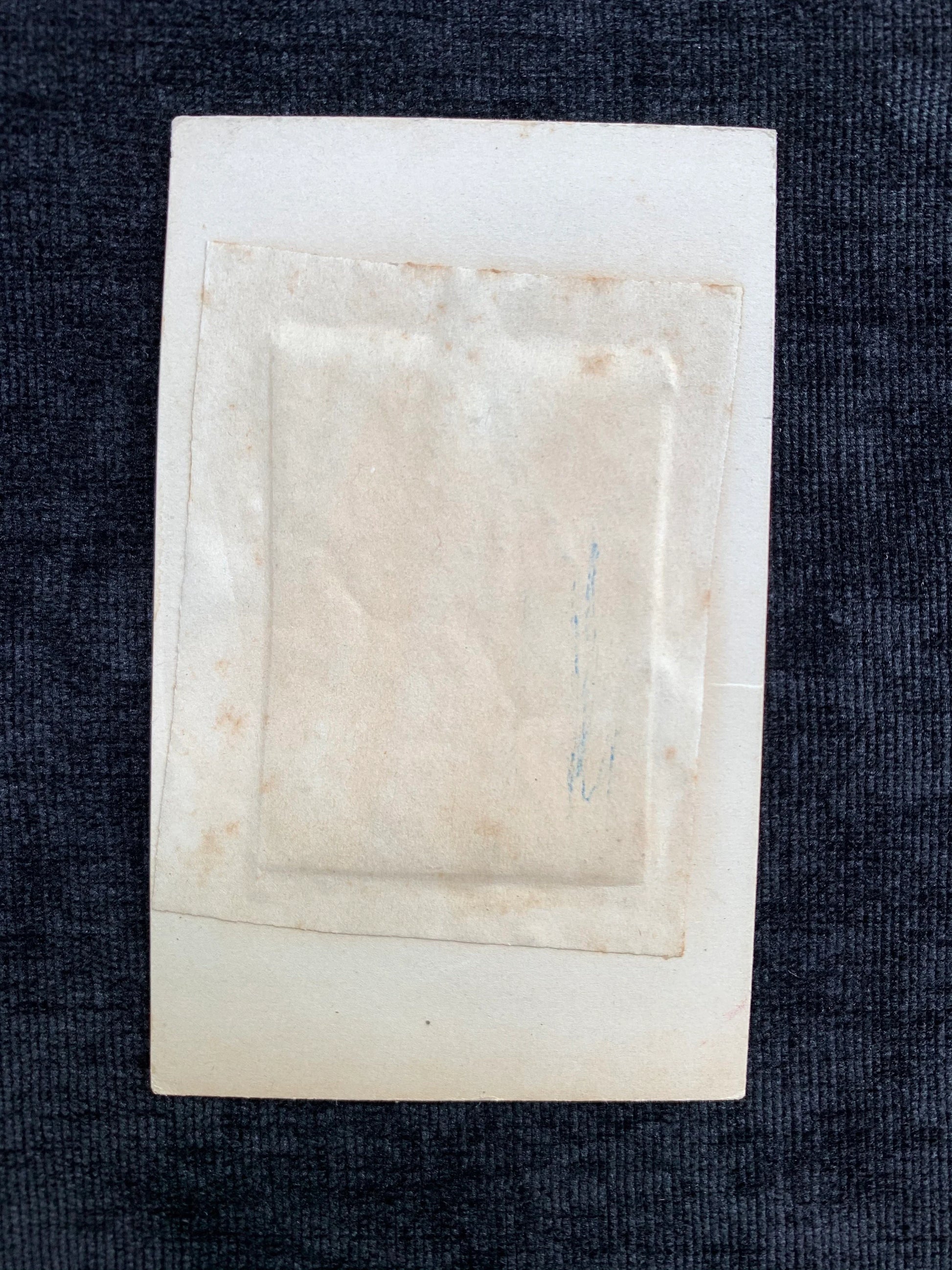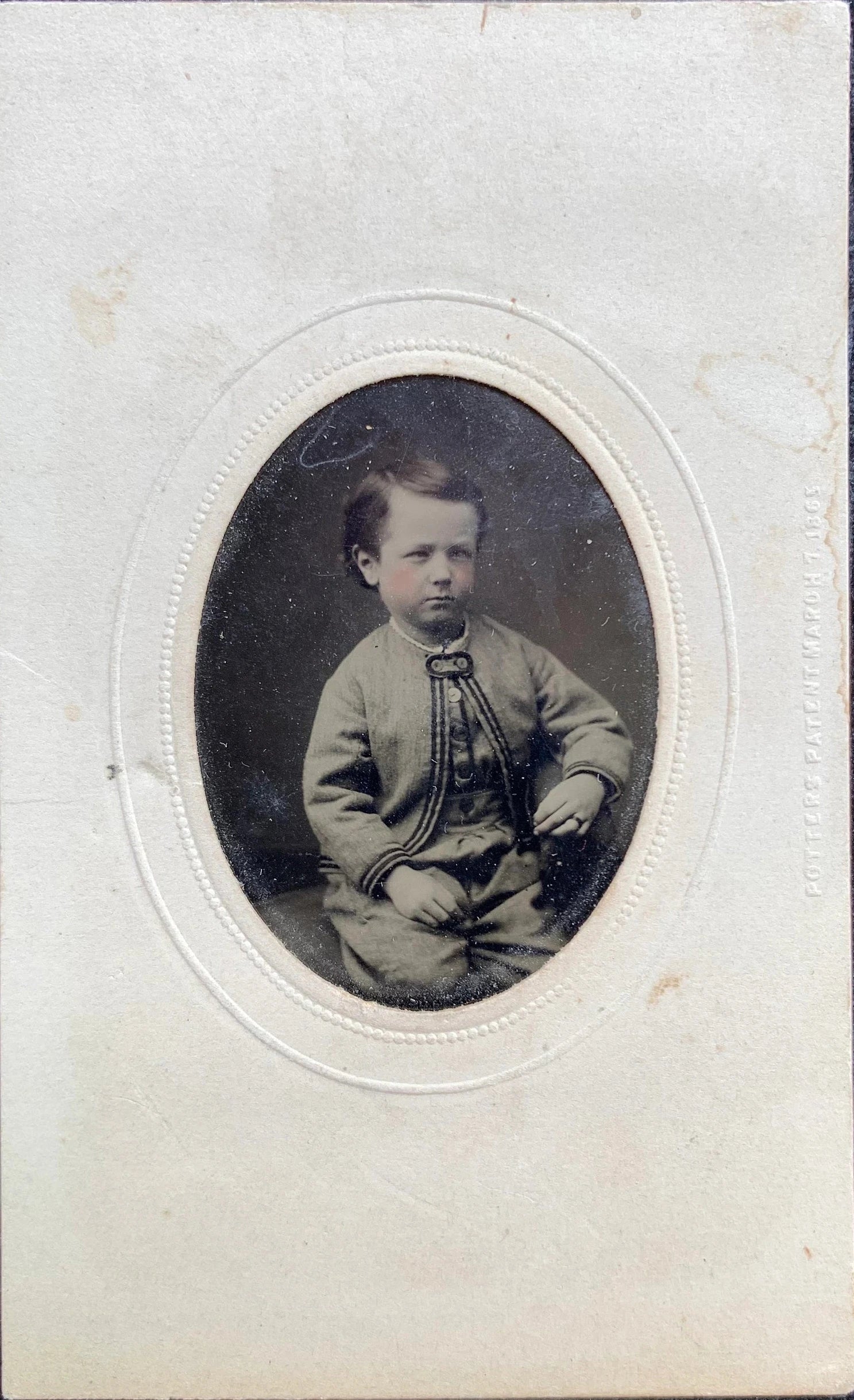 This tintype photograph features a little boy all dressed up in his best clothes, but he doesn't look too happy about sitting still! There is a slight rosy tint to his cheeks. The photograph was likely taken in the 1860s or 1870s. The visible part of the tintype is about 1.75 inches tall.