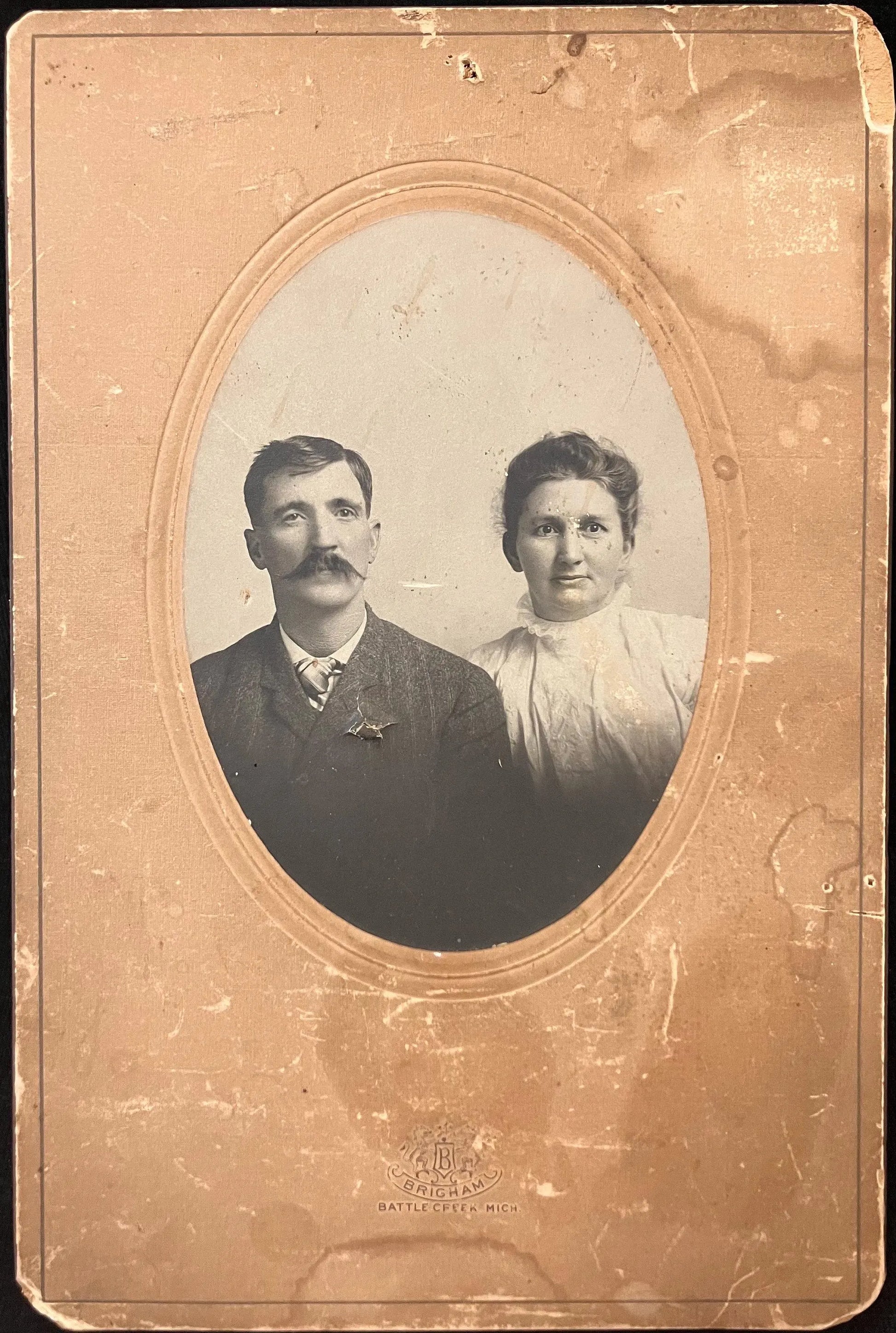 On front: A photo of a Victorian Man and Woman with Brigham Battle Creek, Mich underneath