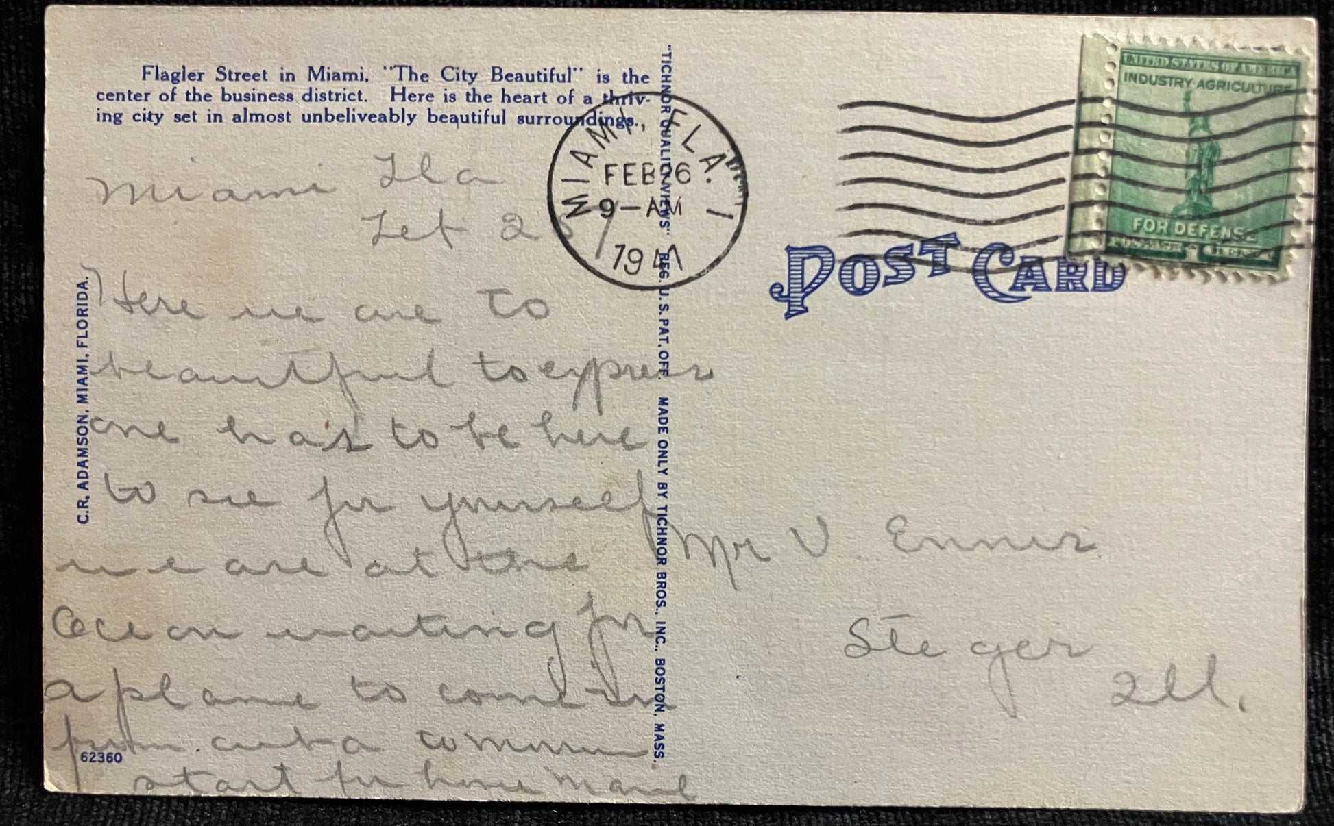 Mailed: Postmark 1941, Miami, FLA., green one-cent Industry Agriculture for Defense Lady Liberty stamp