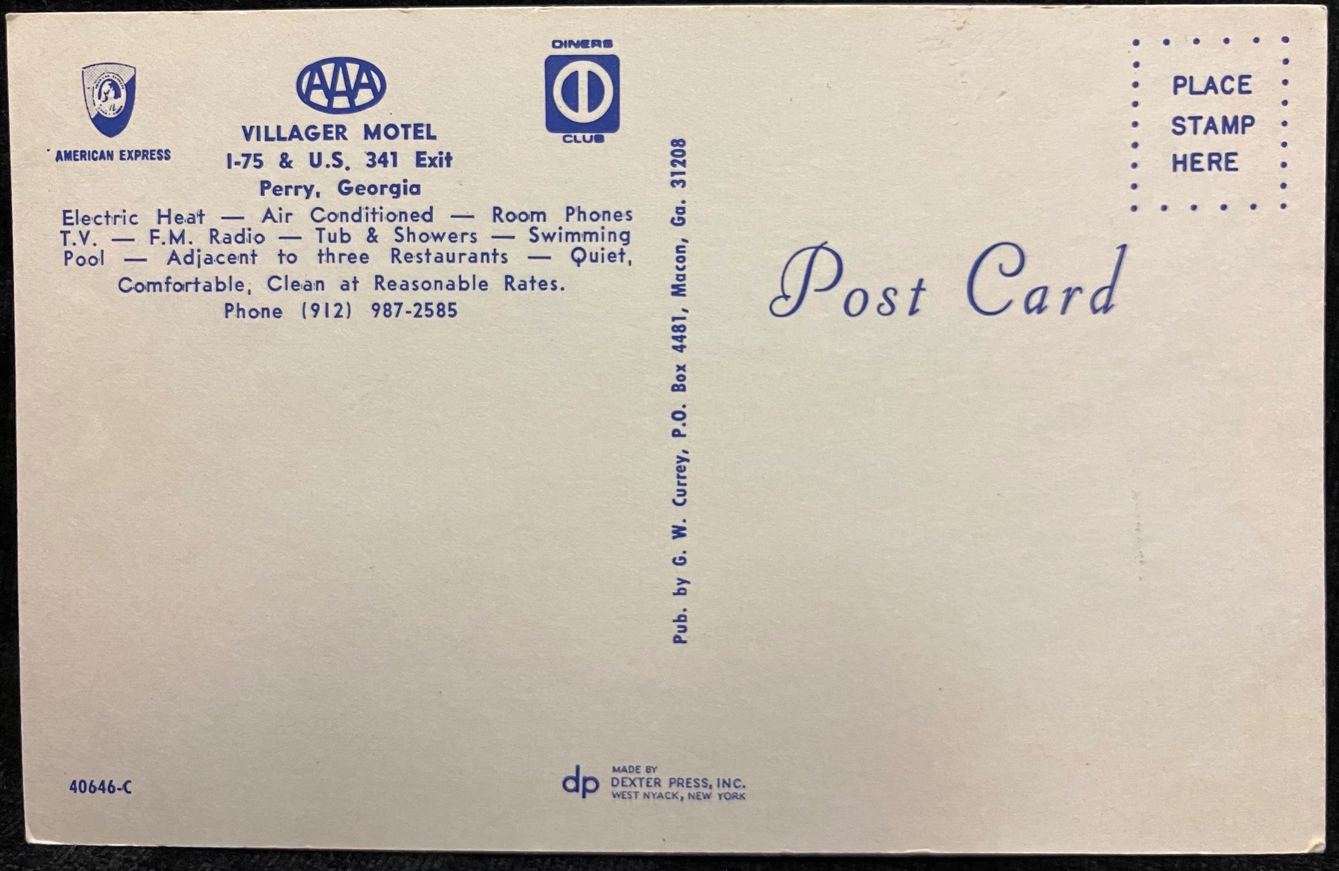 Back: VILLAGER MOTEL CLUE • AMERICAN EXPRESS 1-75 & U.S. 341 Exit Perry, Georgia Electric Heat Air Conditioned T.V. F.M. Radio - Tub & Showers Pool Adiacent to three Restaurants Room Phones Swimming Quiet, Comfortable; Clean at Reasonable Rates. Phone (912) 987-2585