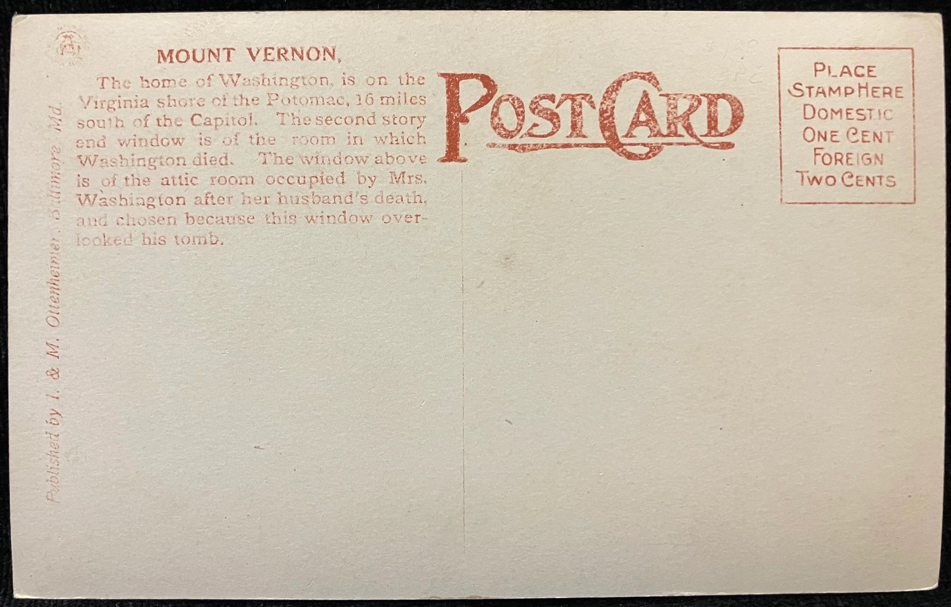 Washington’s Mansion, Mount Vernon, Virginia, 1920s - Vintage American History Postcard