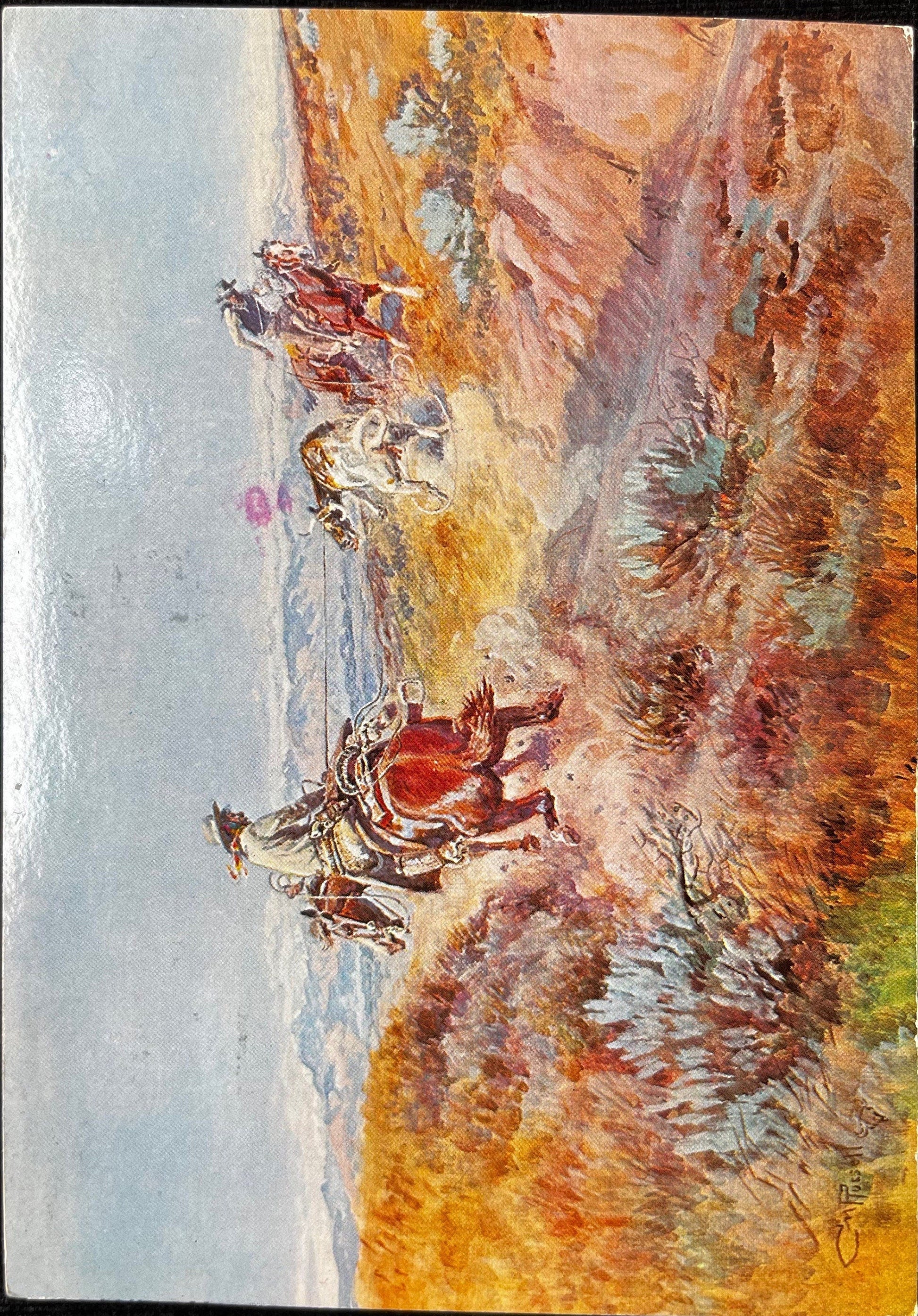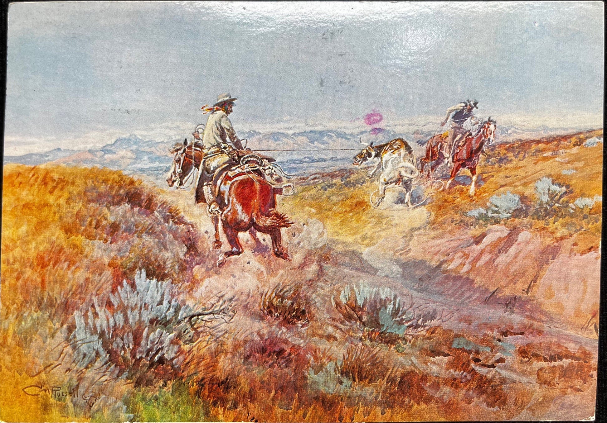 Featuring a scene of two cowboys using their lassos to herd a lost longhorn, this postcard is in great condition. Photographed by Charles Marion Russell, there is a small pink ink stain on the front image above the longhorn. Please refer to the pictures for more details.