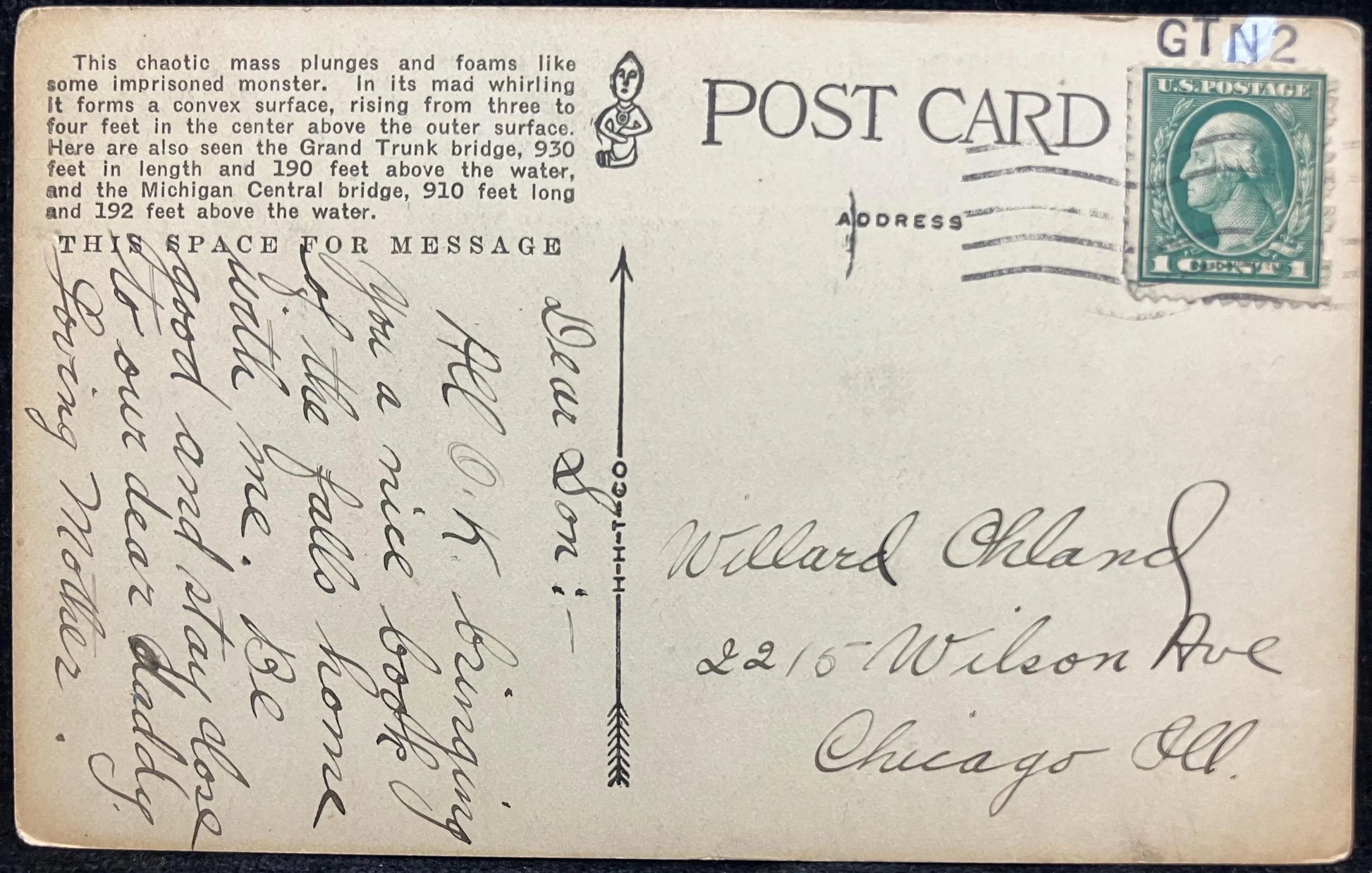 Back: This chaotic mass plunges and foams like some imprisoned monster. In its mad whirling it forms a convex surface, rising from three to four feet in the center above the outer surface. Here are also seen the Grand Trunk bridge, 930 feet in length and 190 feet above the water, and the Michigan Central bridge, 910 feet long and 192 feet above the water.