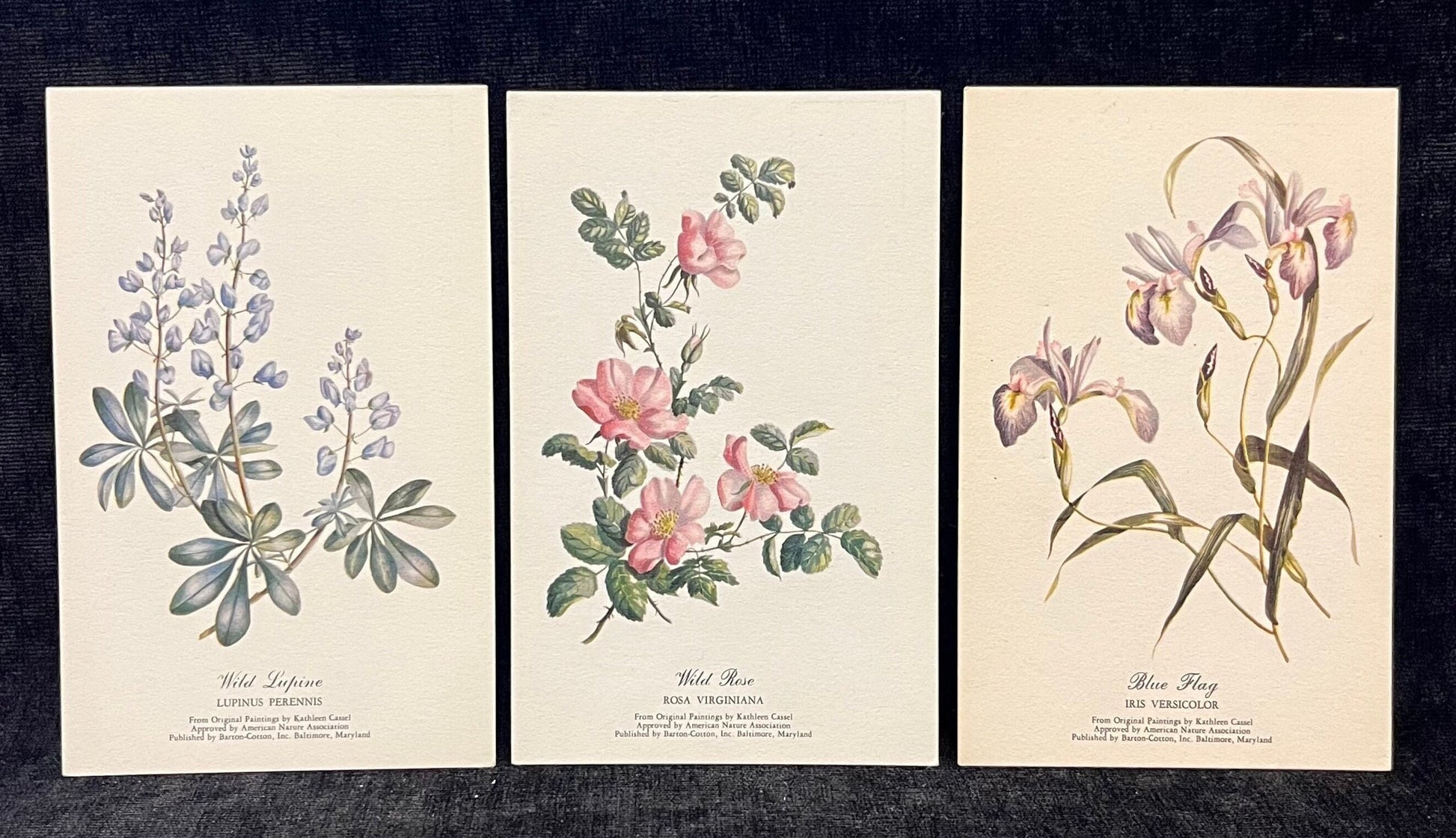Wild Lupine, Wild Rose, and Blue Flag Betty Cares Drawings- Water colored by Kathleen Cassel - Flower Postcards - Set of 3