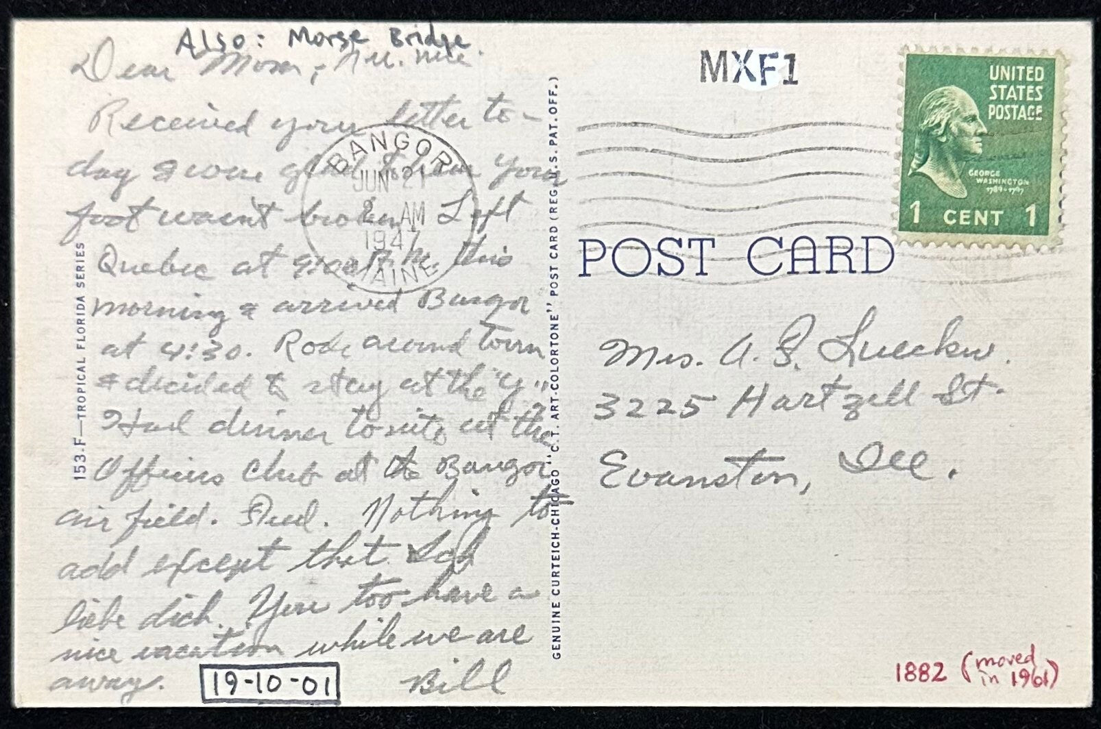 Mailed: Posted June 21, 1947, from Bangor, Maine with a green 1 cent George Washington stamp