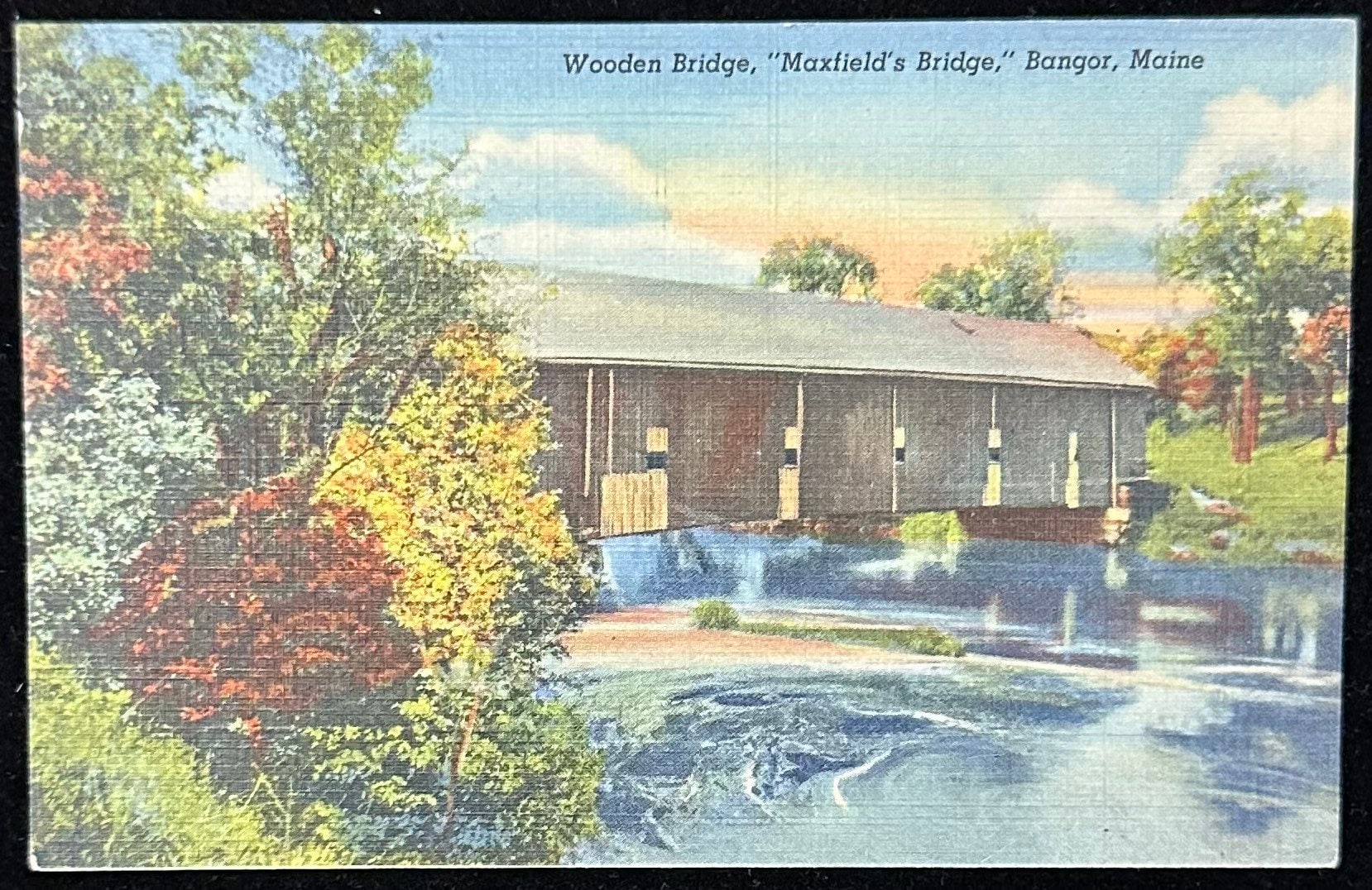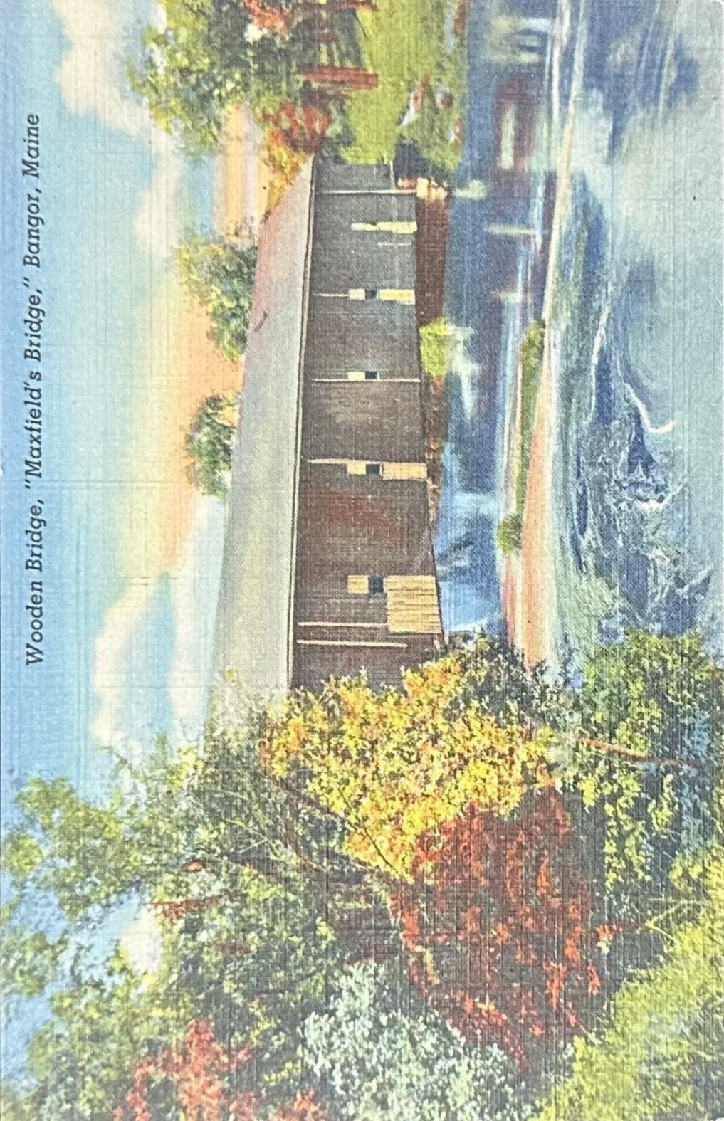 Wooden Bridge - “Maxfield’s Bridge” - Bangor, Maine - 1940s Linen Postcard