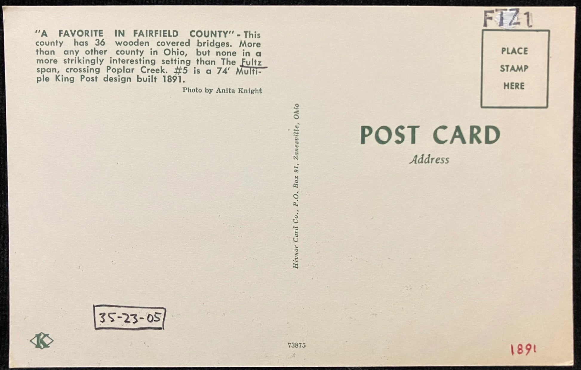 Back: “A FAVORITE IN FAIRFIELD COUNTY” - This county has 36 wooden covered bridges. More than any other county in Ohio, but none in a more strikingly interesting setting than The Fultz span, crossing Popular Creek. #5 is a ‘74 Multiple King Post design built 1891.