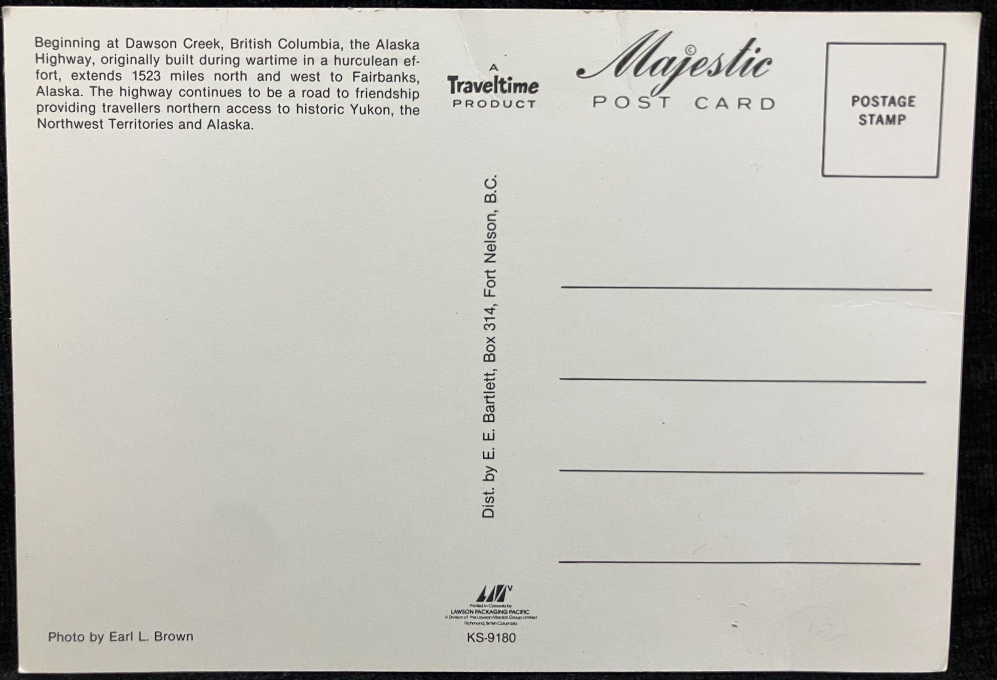 Back: Beginning at Dawson creek, British Columbia the Alaska Highway, originally build during wartime in a hurculean effort, extends 1523 miles north and west to Fairbanks, Alaska. The highway contuse to be a road to friendship providing travellers northern access to historic Yukon, the Northwest Territories and Alaska.
