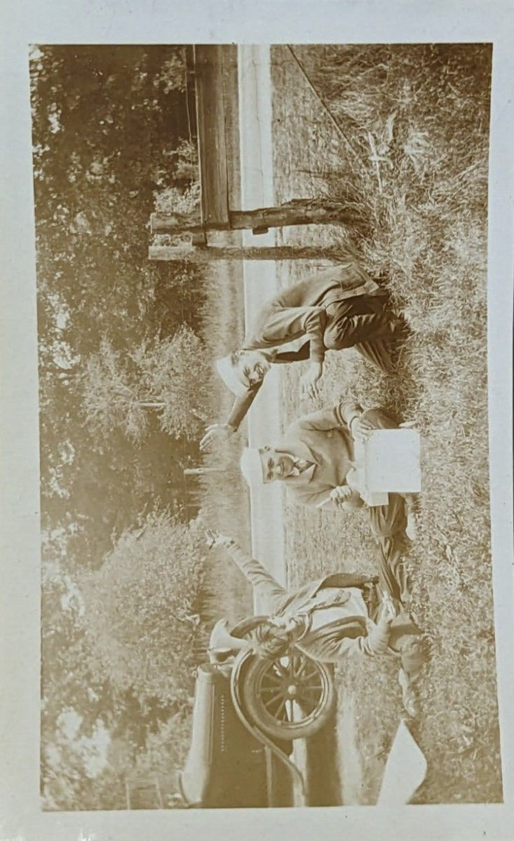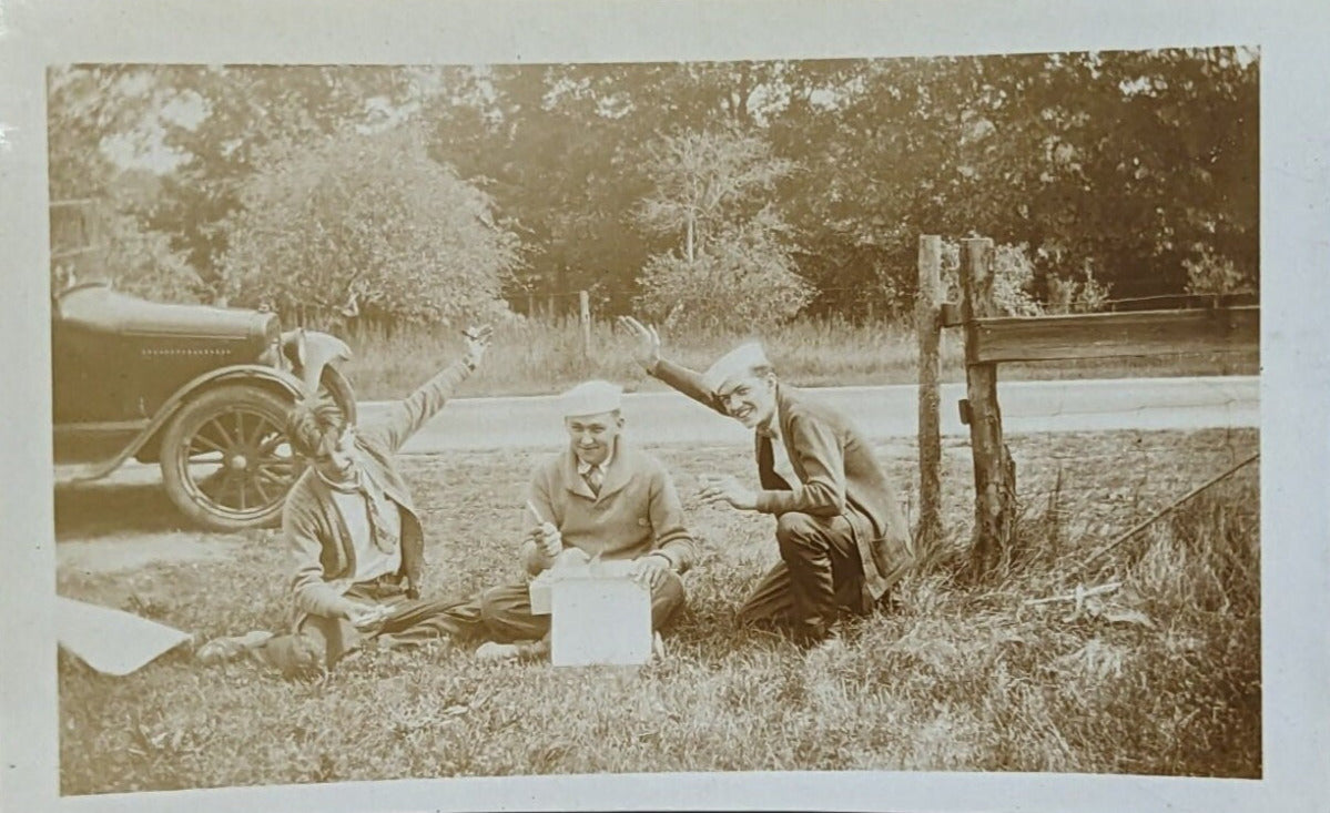 This is a fun photo of three brothers hanging out by the roadside. Two are wearing White Naval Hats. They are brothers, which we know from other photos found with this one. They are out for a Sunday car ride, a common pass-time in the 1920s as the family car allowed them freedom to roam.
