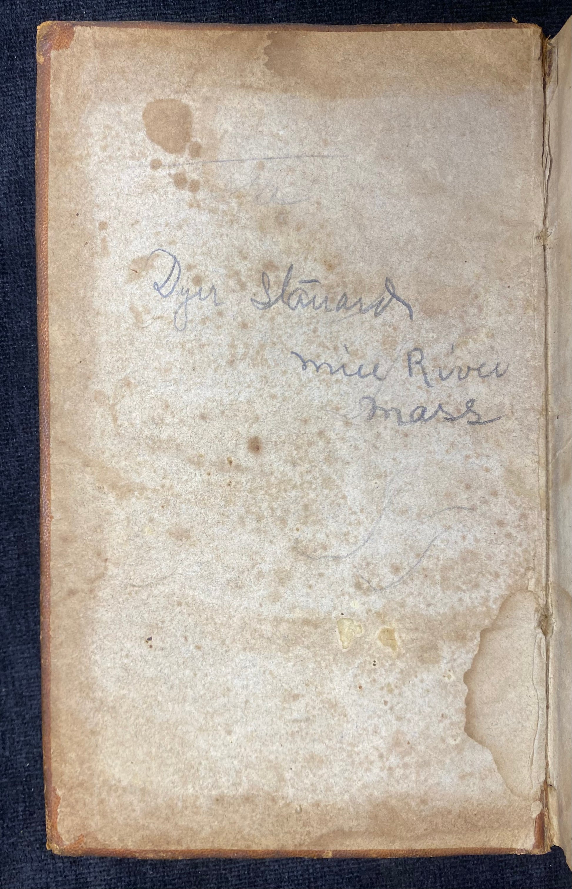 This copy has some rough spots on the cover, and the leather has started splitting a bit - specifically on the back cover. The pages have discoloration from age, some corners are bent/folded, and there are a few tears throughout. Pencil writing and markings can be seen on the inside front and back cover.