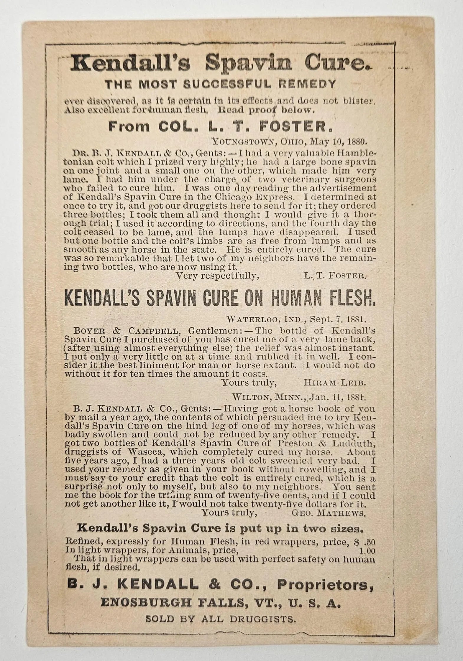 1880s Kendall's Spavin Cure for man and beast- Advertisement Trade Card- Enosburgh, Vermont