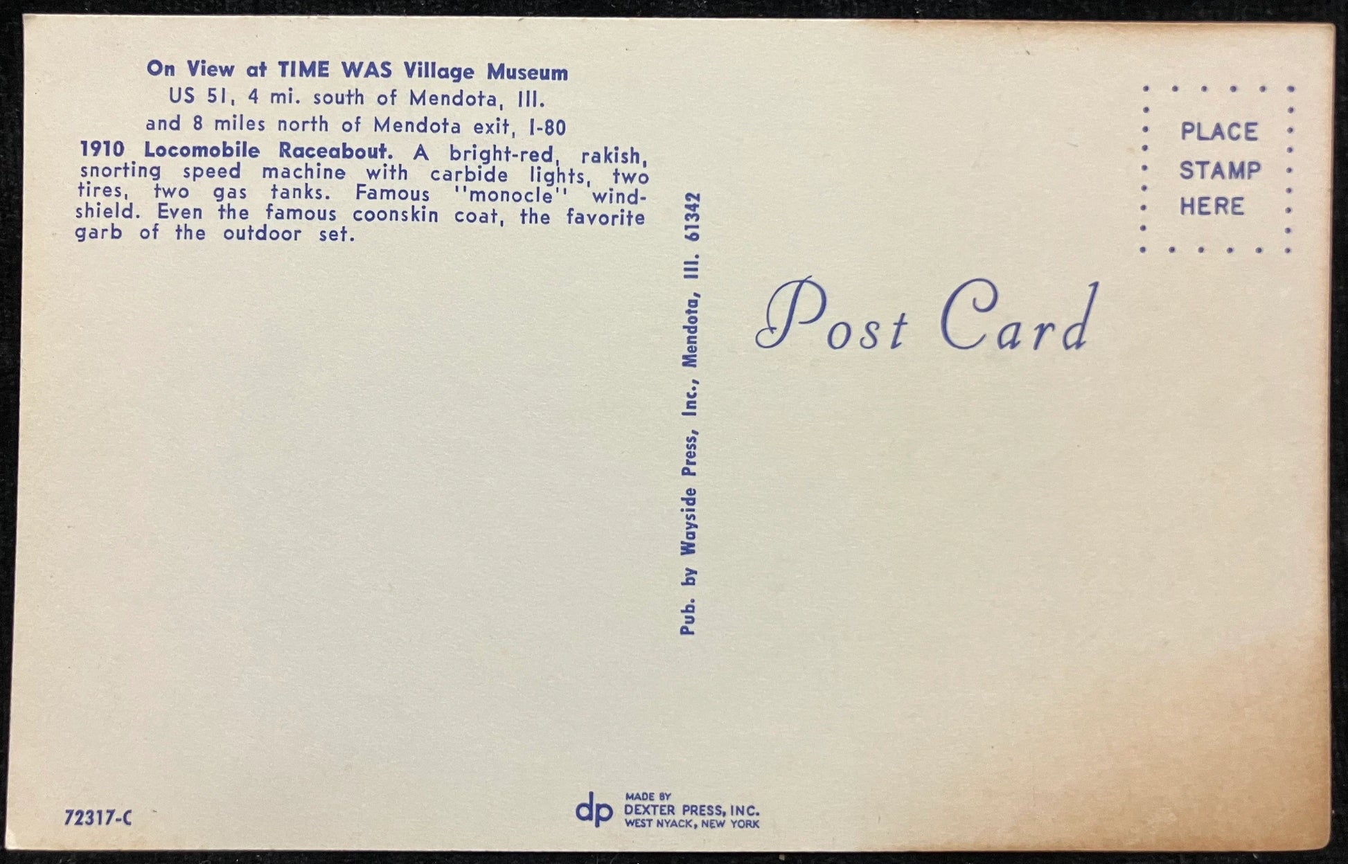 On back: On View at TIME WAS Village Museum US 51, 4 mi. south of Mendota, Ill. and 8 miles north of Mendota exist, I-80 1910 Locomobile Raceabout. A bright-red, rakish, snorting speed machine with carbide lights, two tires, two gas tanks. Famous "monocle" windshield. Even the famous coonskin coat, the favorite garb of the outdoor set.
