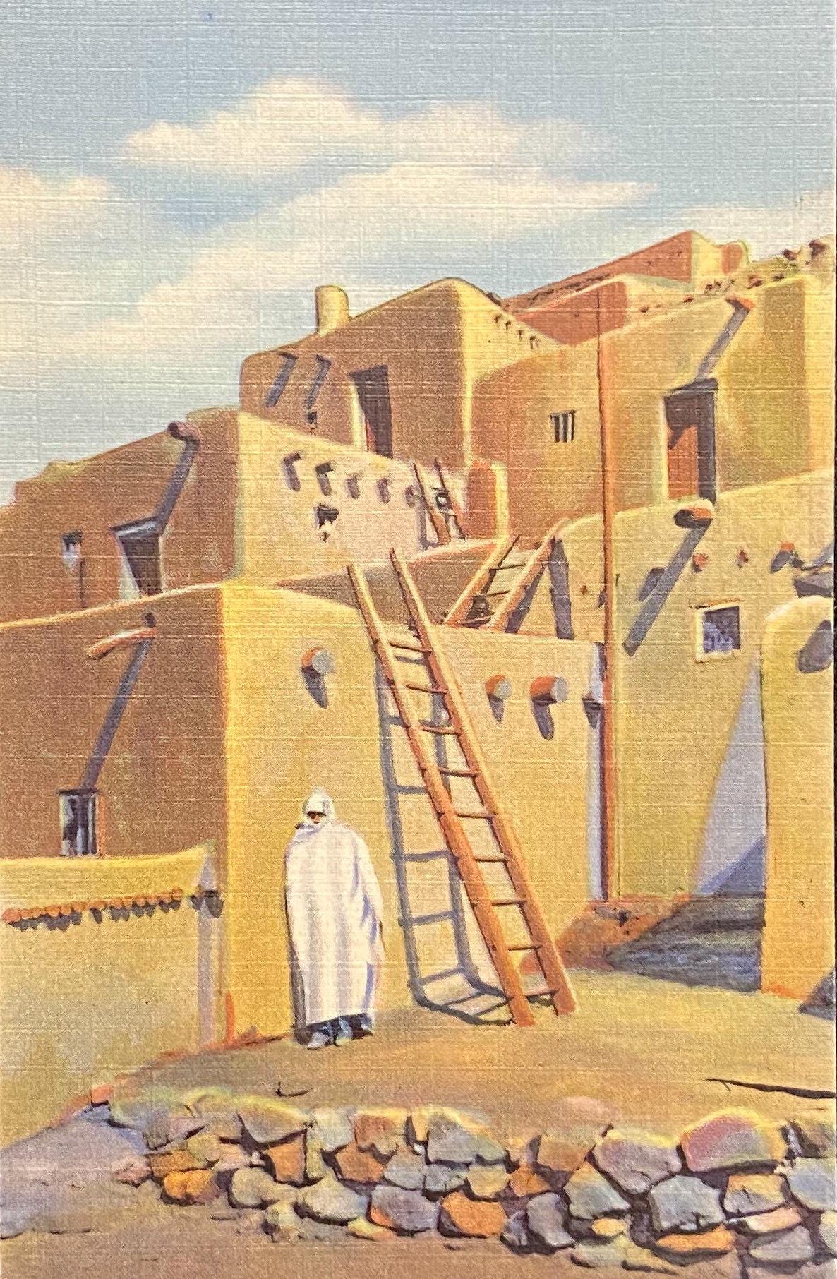 213 - A Corner in Taos Pueblo, Taos, N.M. | "The white blanket worn by this Taos Indian contrasts sharply with the brown adobe walls of ancient Taos Pueblo, located in northern New Mexico. Taos Indians wear white blankets in summer and red and blue blankets in winter. Silhouetted against the sky on the tops of the houses at sundown, they make unforgettable pictures."