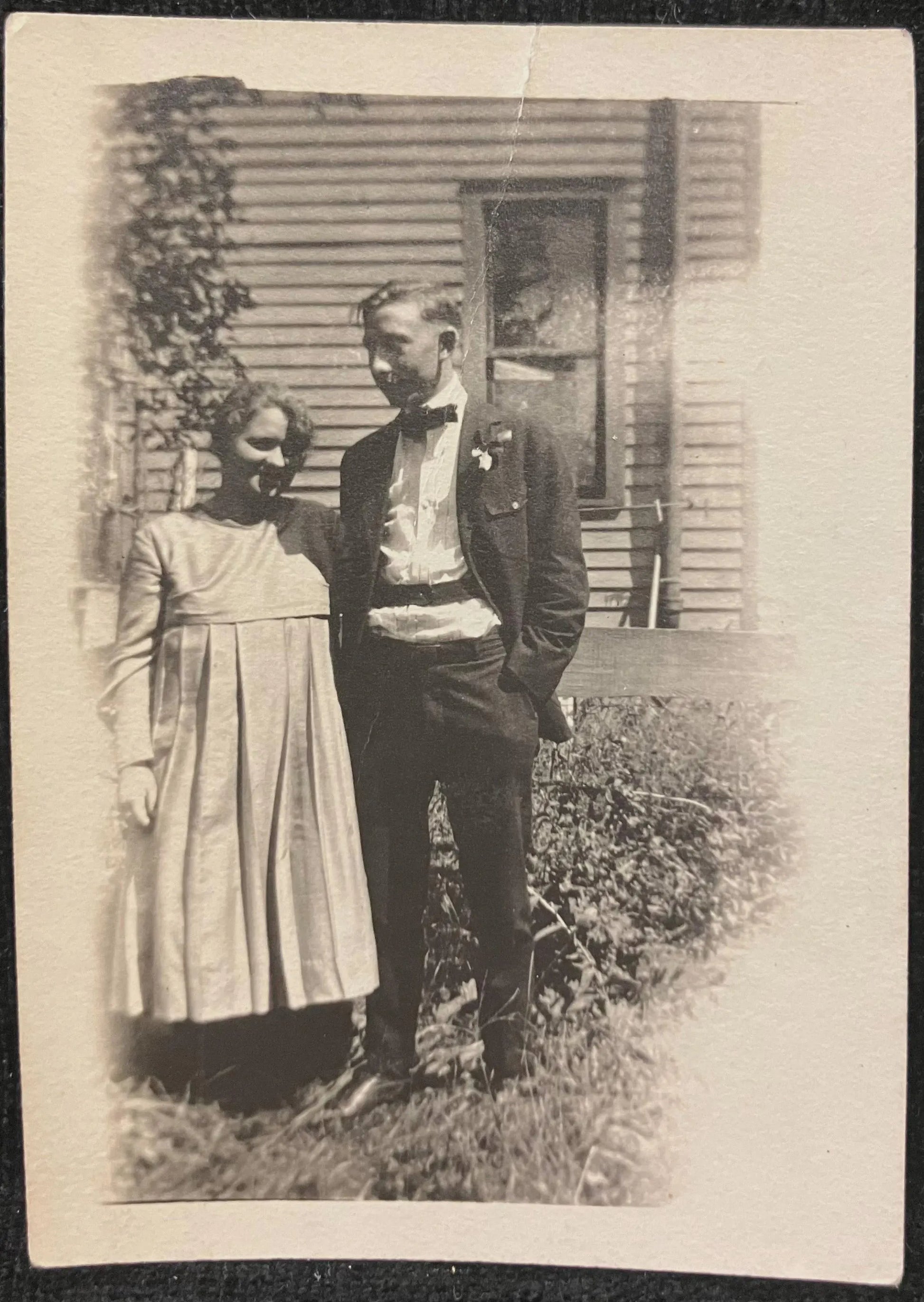 On front: A photo of a couple standing together in front of a house