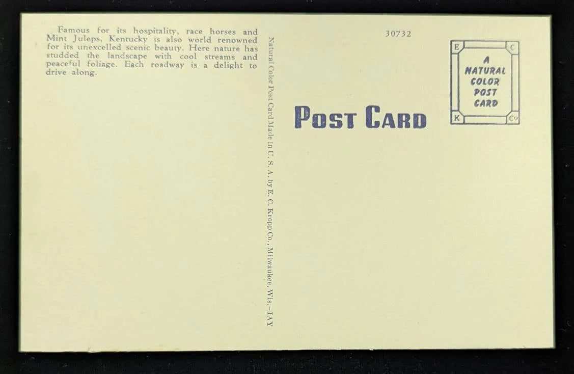 Back: Famous for its hospitality, race horses and Mint Juleps, Kentucky is also world-renowned for its unexcelled scenic beauty. Here nature has studded the landscape with cool streams and peaceful foliage. Each roadway is a delight to drive along