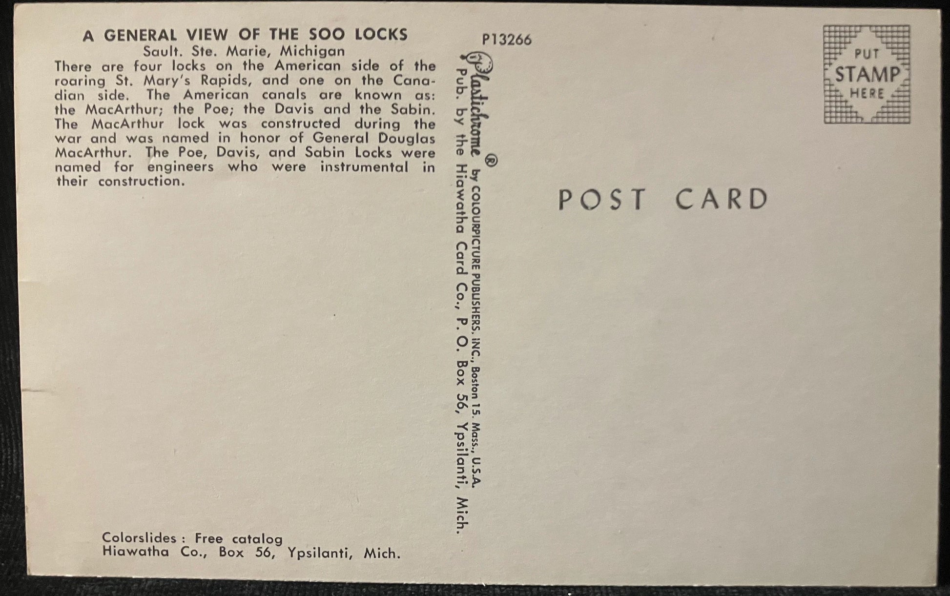 On back: A GENERAL VIEW OF THE SOO LOCKS Sault. Ste. Marie, Michigan. There are four locks on the American side of the roaring St. Mary’s Rapids, and one on the Canadian side. The American canals are known as: the MacArthur, the Poe; the Davis and the Sabin. The MacArthur lock was constructed during the war and was named in honor of General Douglas MacArthur. The Poe, Davis, and Sabin Locks were named for engineers who were instrumental in their construction.