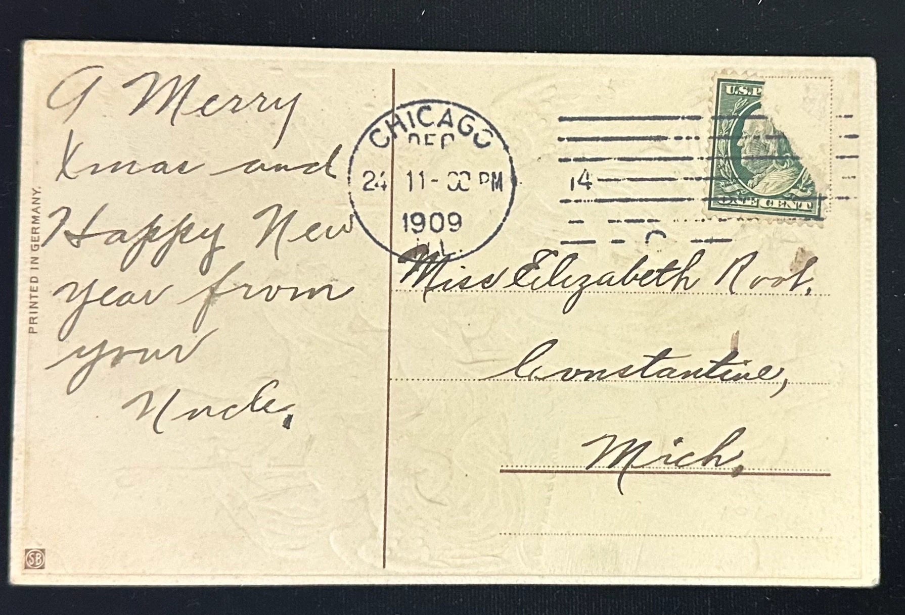 Mailed: Posted on December 24th, 1909 from Chicago, Illinois with a green 1-cent Ben Franklin stamp