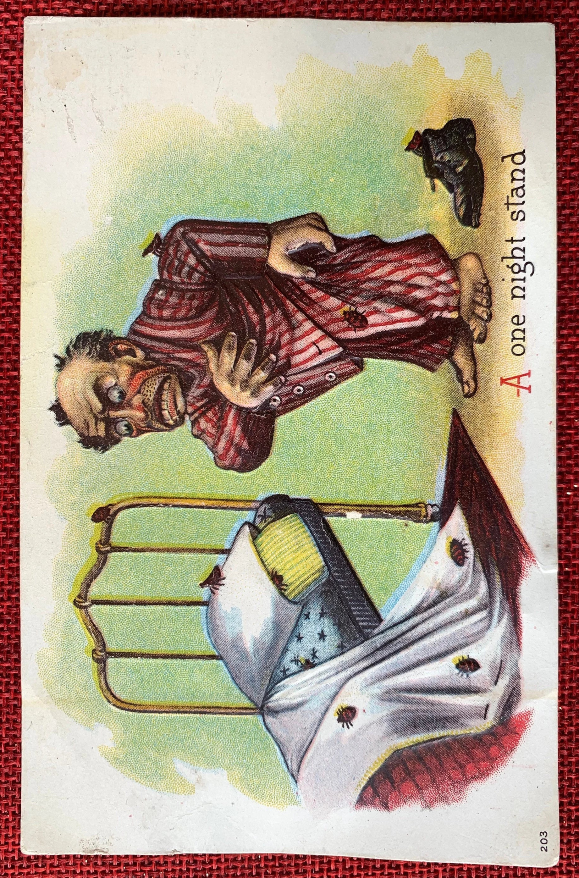 This postcard features an illustration of a man in pajama with bugs on him next to an unmade bed with bugs on it. The illustration is embossed.