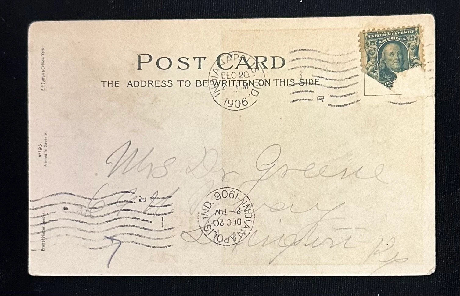 Mailed: Posted on December 20th, 1906 from Indianapolis, Indiana with a Green 1 cent Ben Franklin stamp, part of stamp missing
