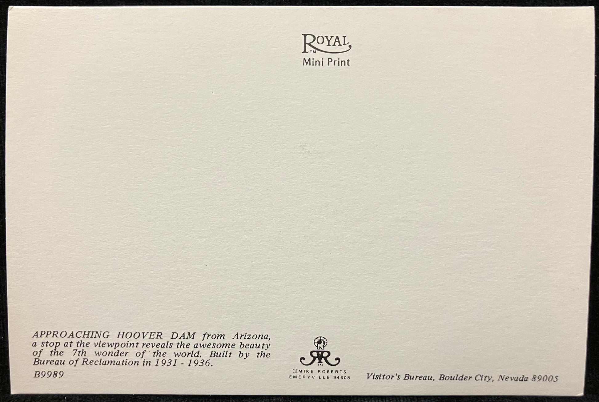 On back: APPROACHING HOOVER DAM from Arizona, a stop at the viewpoint reveals the awesome beauty of the 7th wonder of the world. Built by the Bureau of Reclamation in 1931 - 1936.