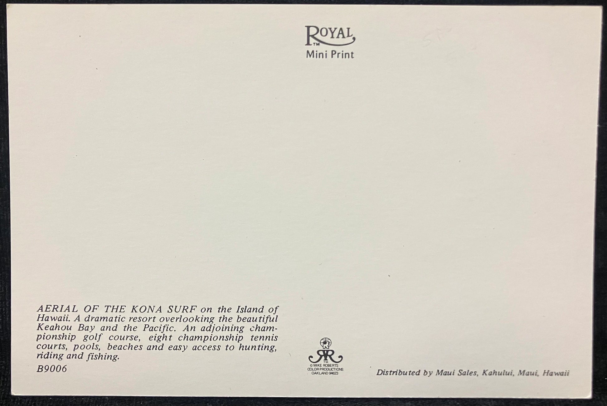 Back: AERIAL OF THE KONA SURF ont he Island of Hawaii. A dramatic resort overlooking the beautiful Keahou Bay and the Pacifc. An adjoining championship golf course, eight championship tennis courts, pools, beaches and easy access to hunting, riding and fishing.
