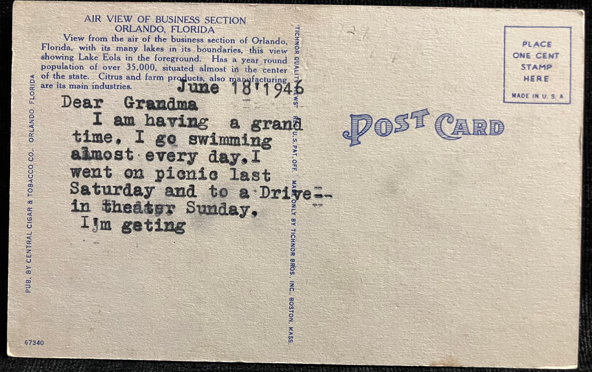 Back: AIR VIEW OF BUSINESS SECTION ORLANDO, FLORIDA View from the air of the business section of Orlando, Florida, with its many lakes in its boundaries, this view showing Lake Ella in the foreground. Has a year round population of over 35,000, situated almost in the center of the state. Citrus and farm products, also manufacturing are its main industries.