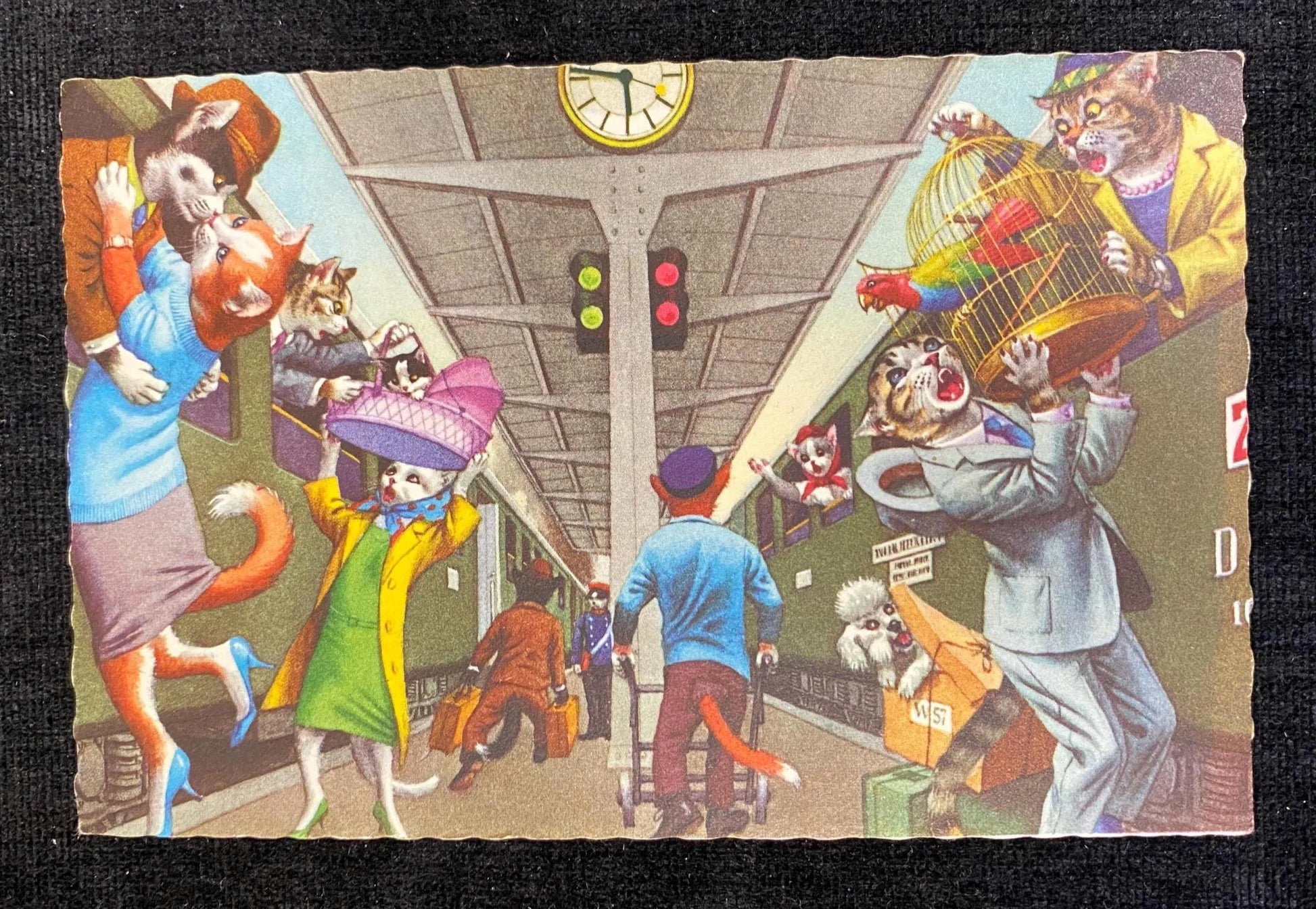 Alfred Mainzer Fantasy Postcard - Train Departure for the Cats - Cats Dressed and Acting Like People - Eugen Hartung Anthropomorphic Cats
