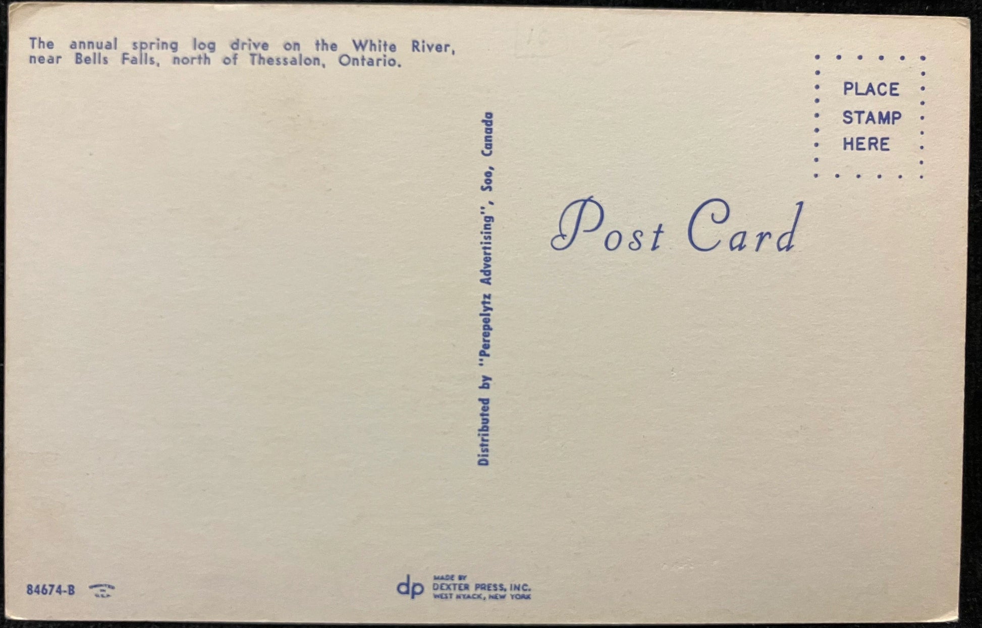 On front: A photo of Annual Spring Log Drive on White River in Ontario, Canada