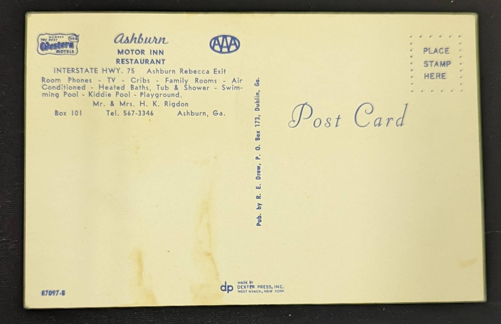 Ashburn Motor Inn Restaurant Hotel/Motel, Ashburn, Georgia - Vintage Postcard