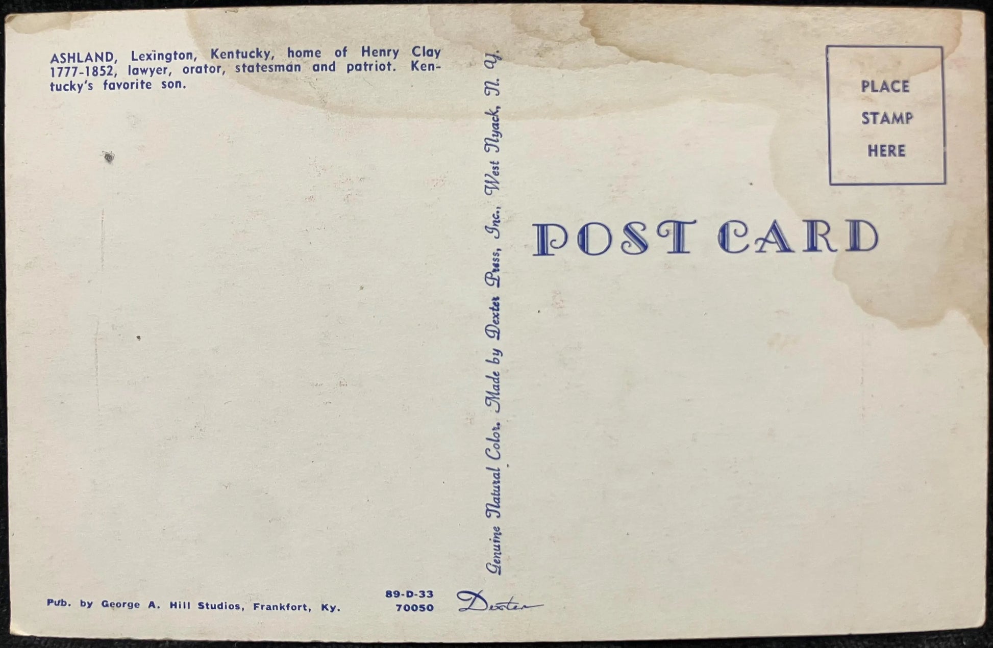 Back: ASHLAND, Lexington Kentucky, home of Henry Clay lawyer, orator, statesman and patriot. Kentucky's favorite son.