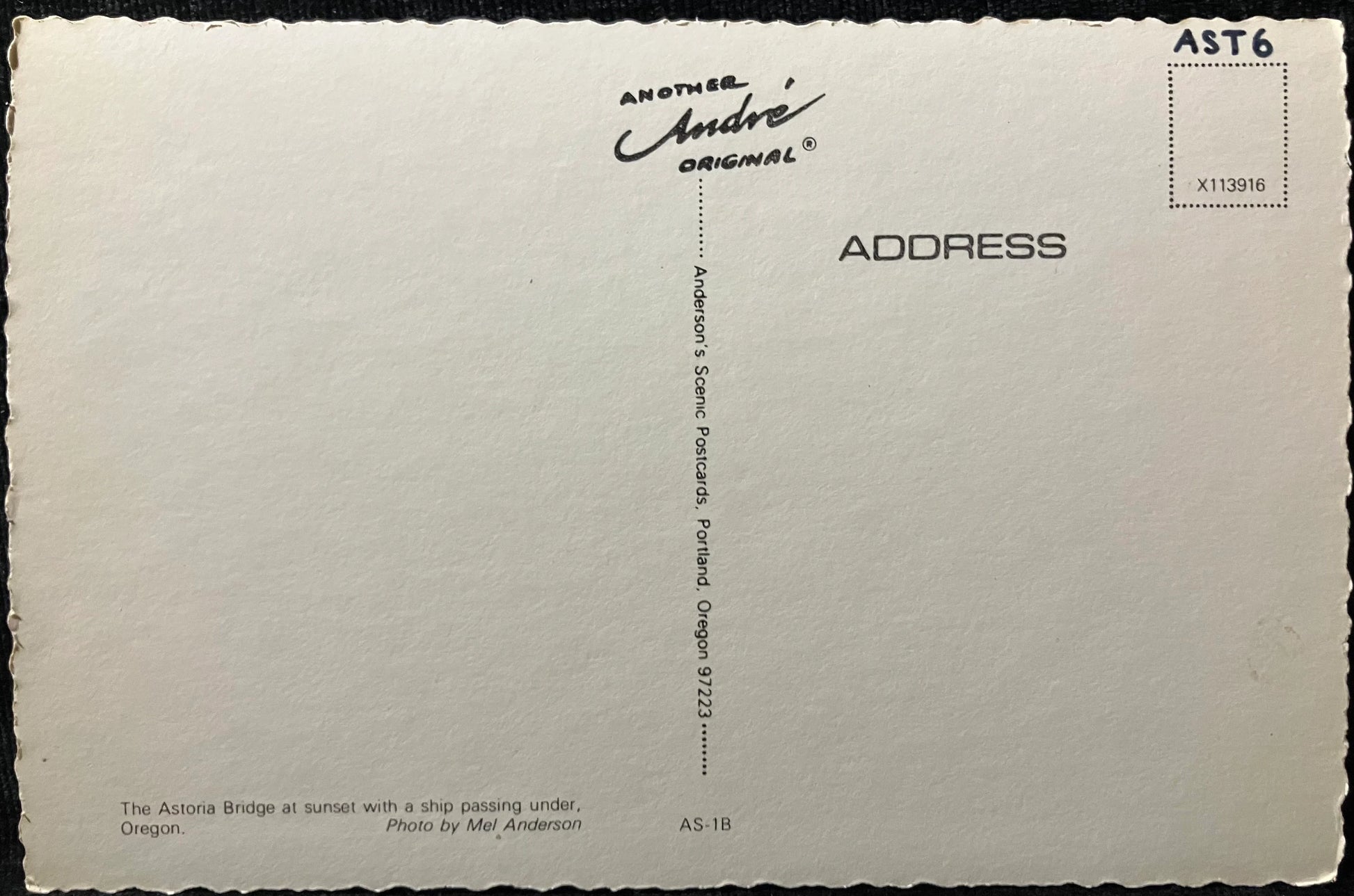 On back: The Astoria Bridge at sunset with a ship passing under, Oregon