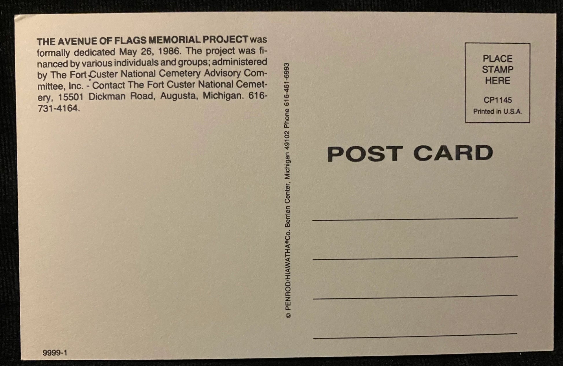 On back: The Avenue of Flags Memorial Project was formerly dedicated May 26, 1986. The project was financed by various individuals and groups; administered by The Fort Custer National Cemetery Advisory Committee, Inc. - Contact The Fort Custer National Cemetery. 15501 Dickamn Road, Augusta, Michigan. 616-731-4164.