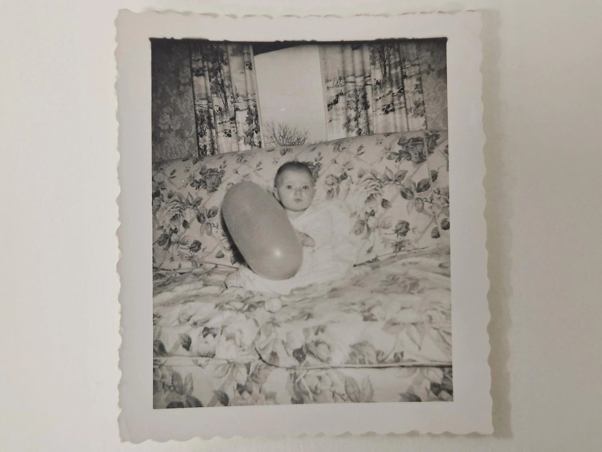 Baby With Balloon On Floral Patterned Couch - Mid Century Photo - late 1940s early 1950 Decor - 1940 black and white photo