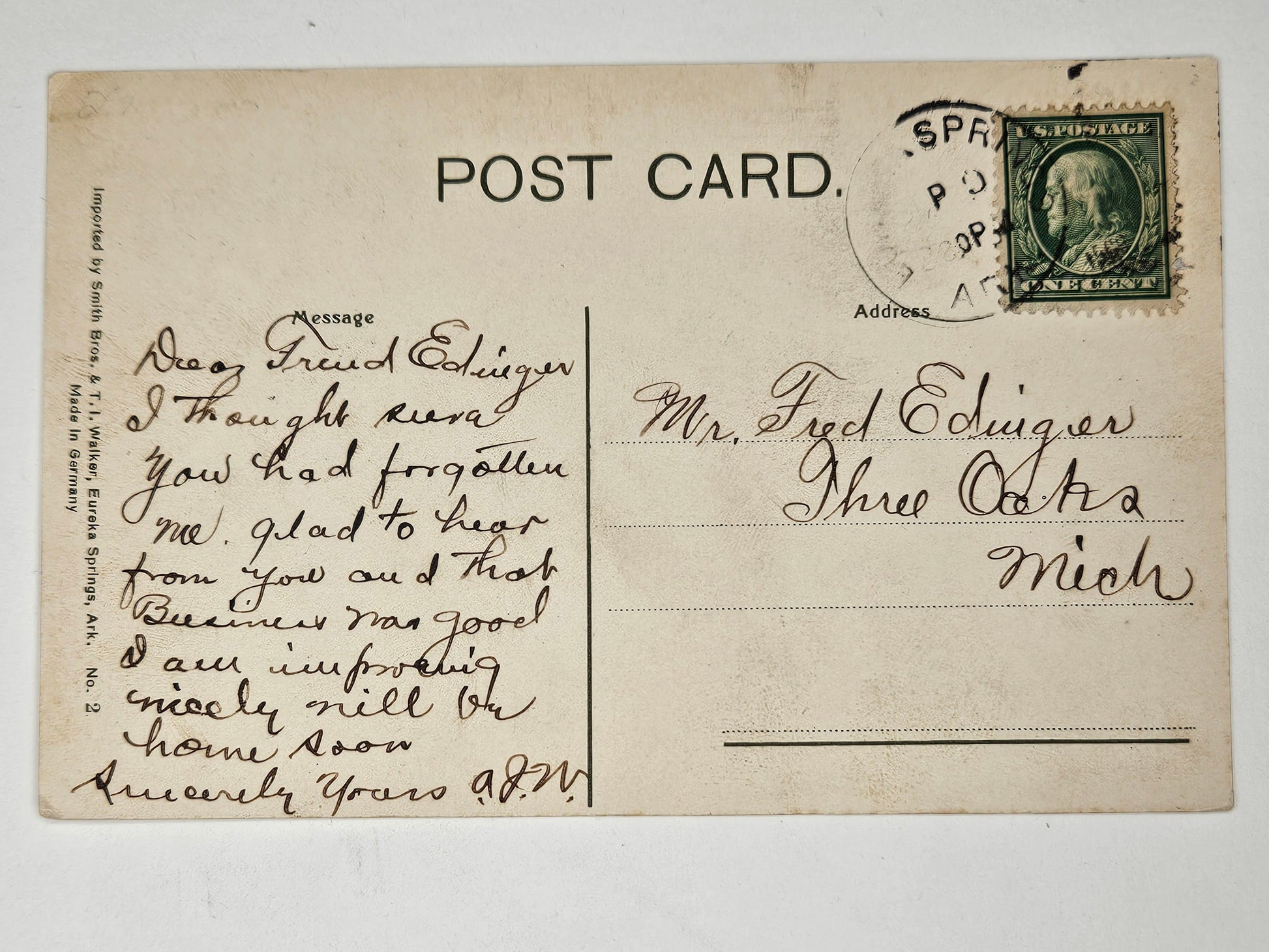 Back: Imported By Smith Bros.& T.I. Walker, Eureka Springs, Ark. No. 2 Made In Germany- The Water of the Springs was called healing water by the Native Americans, then when settlers arrived they found it healed skin ailments, They bottled it as medicinal, plus made it a destination for healing in Victorian times. This 1910 card is from a gentleman who says he is getting better and will soon return home.