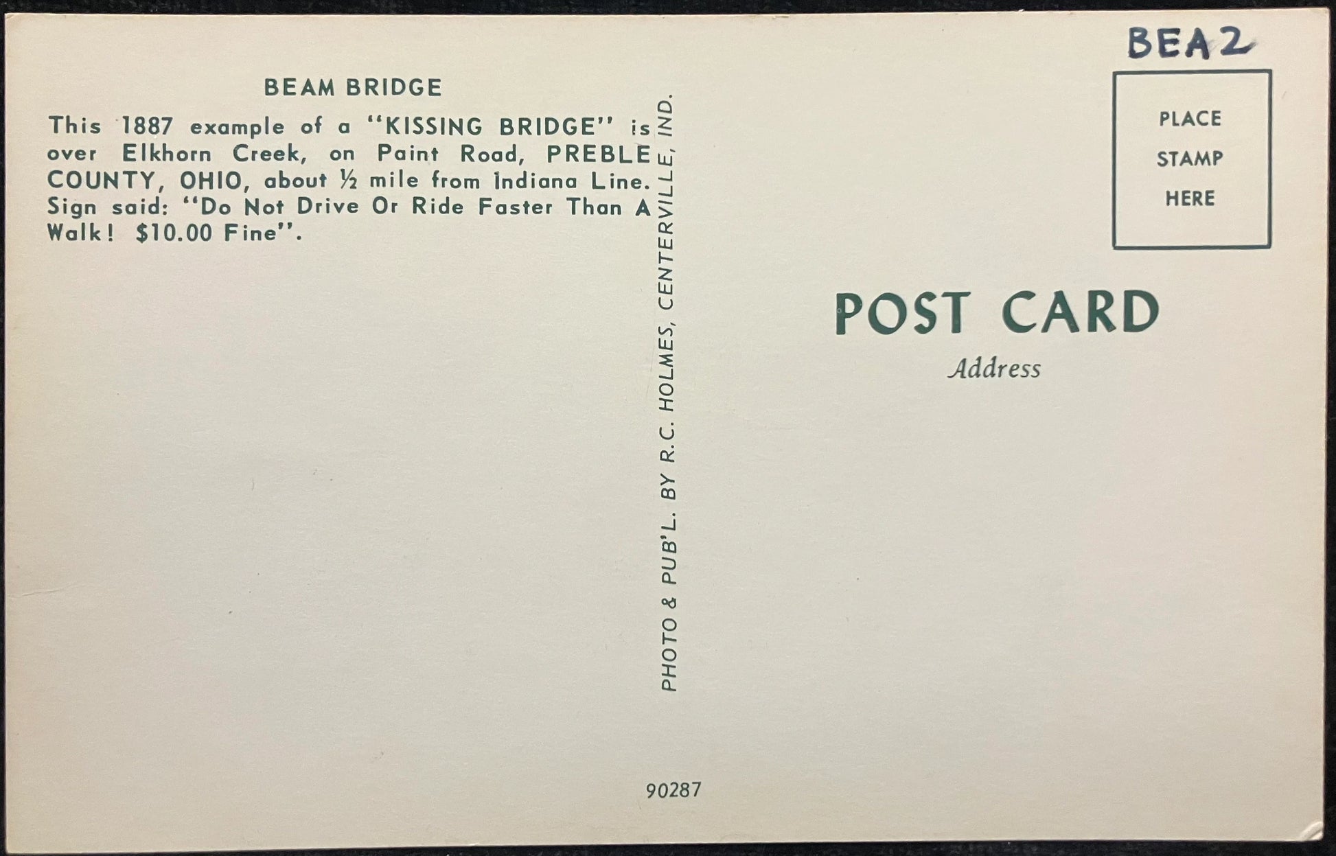 Back: BEAM BRIDGE This 1887 example of a “KISSING BRIDGE” is over Elkhorn Creek, on Paint Road, PREBLE COUNTY, OHIO, about 1/2 mile from Indiana Line. Sign said: “Do Not Drive or Ride Faster Than a Walk! $10. Fine”.